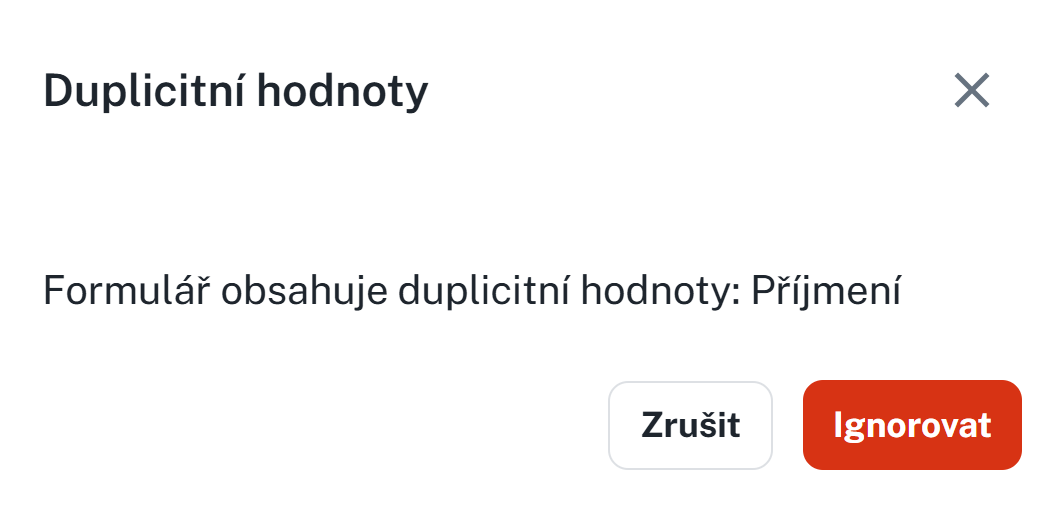 Pole může obsahovat duplicitní hodnotu, ale vypíše varování. Značí se oranžovým vykřičníkem.