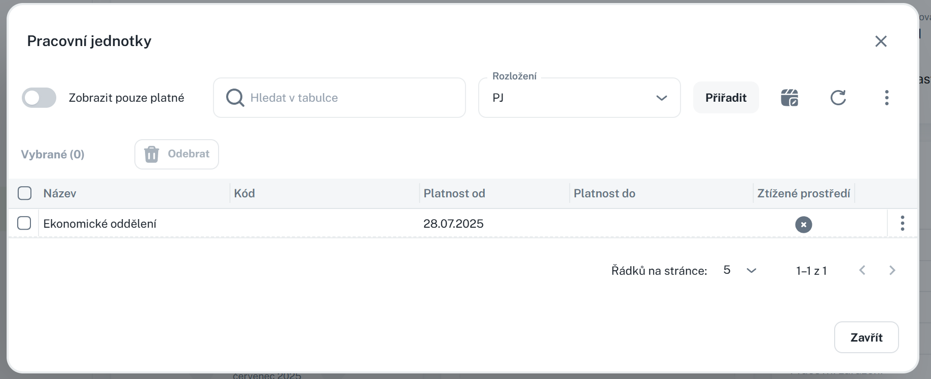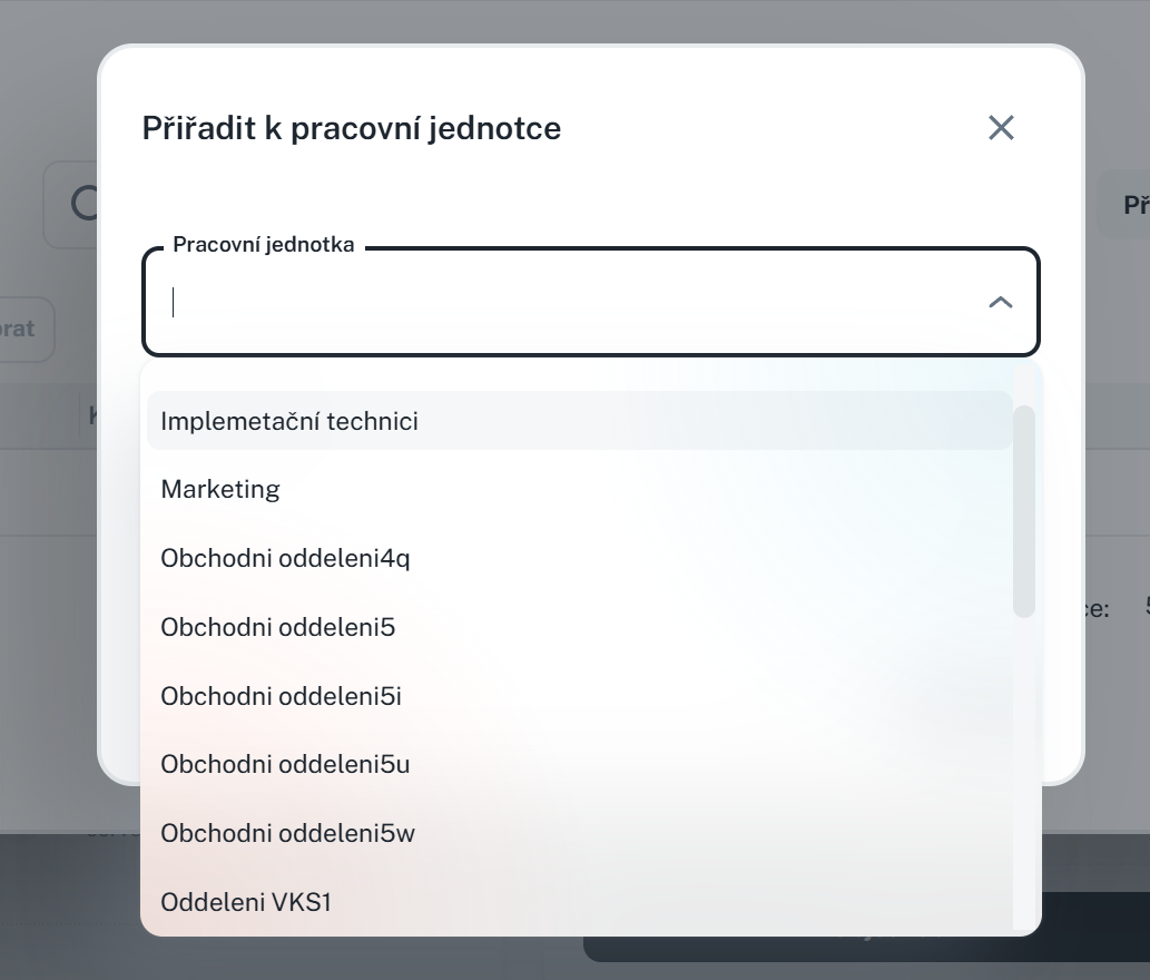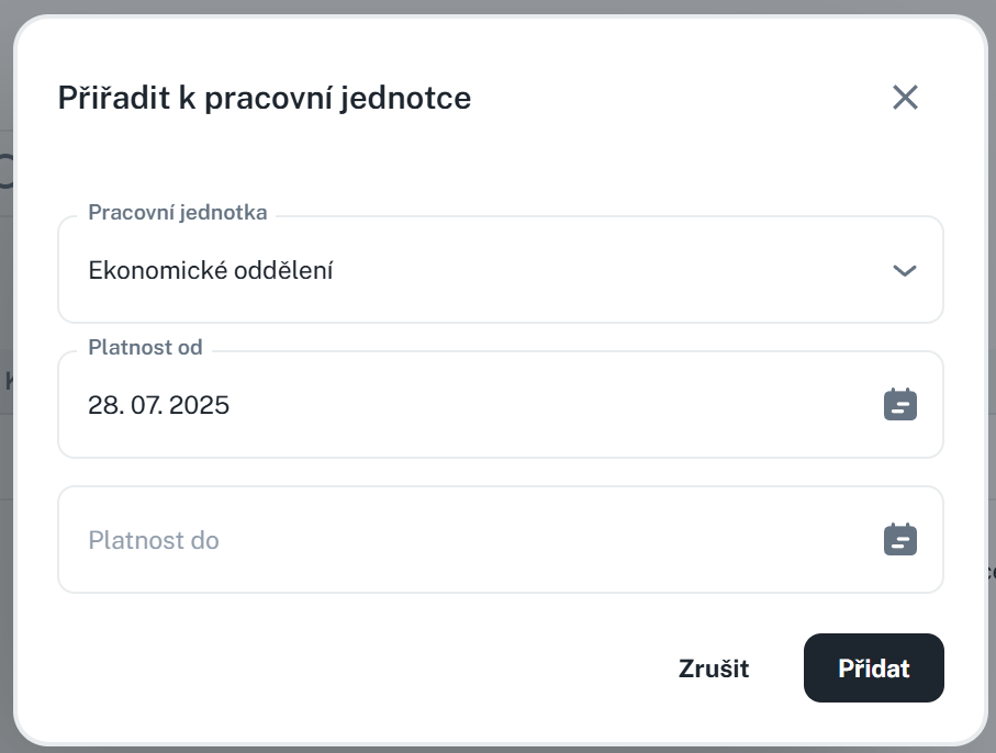 Kliknutím na “Přiřadit” se Vám zobrazí okno s výběrem jednotek, po jejím zvolení nastavte datum platnosti, případě i datum platnosti do a klikněte na “Přidat” → pracovní jednotka se přiřadí osobě a objeví se v seznamu.