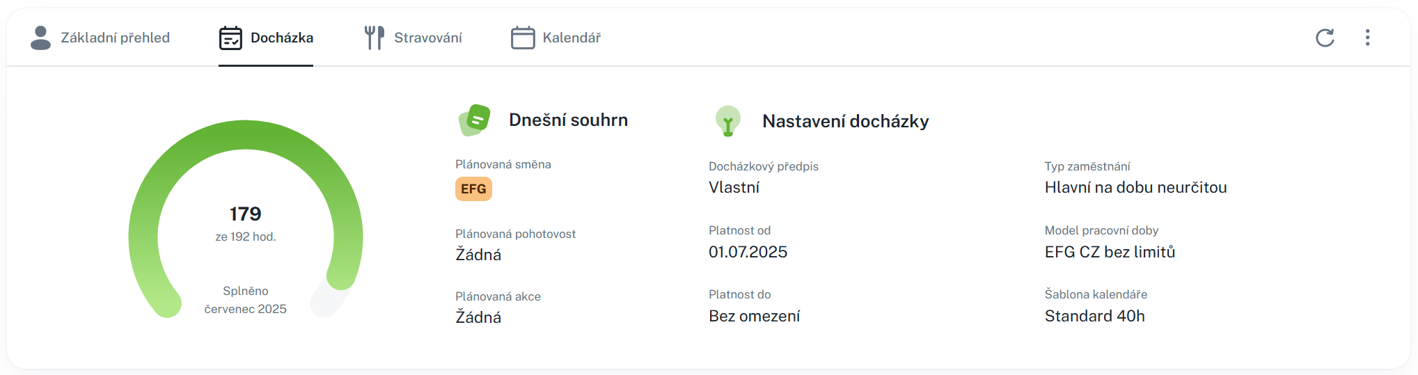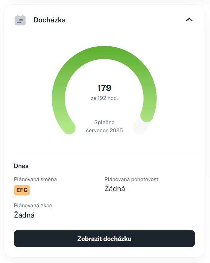 Po přidání docházkového předpisu se zobrazí graf s přehledem – ukazuje, kolik hodin již bylo odpracováno a kolik ještě zbývá v rámci daného měsíce. Tyto i ostatní údaje vycházejí z nastaveného docházkového předpisu.