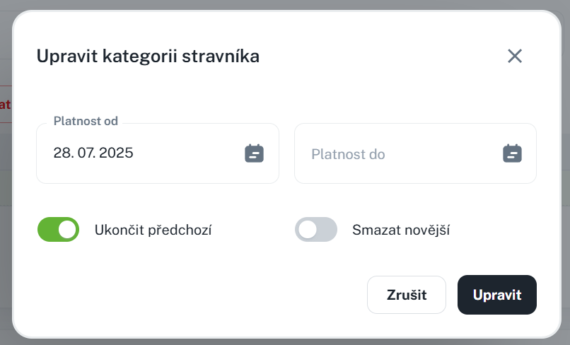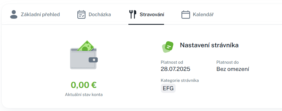 Tato sekce umožňuje nastavit kategorii strávníka a v případě potřeby také provést objednávku jídla za konkrétní osobu.