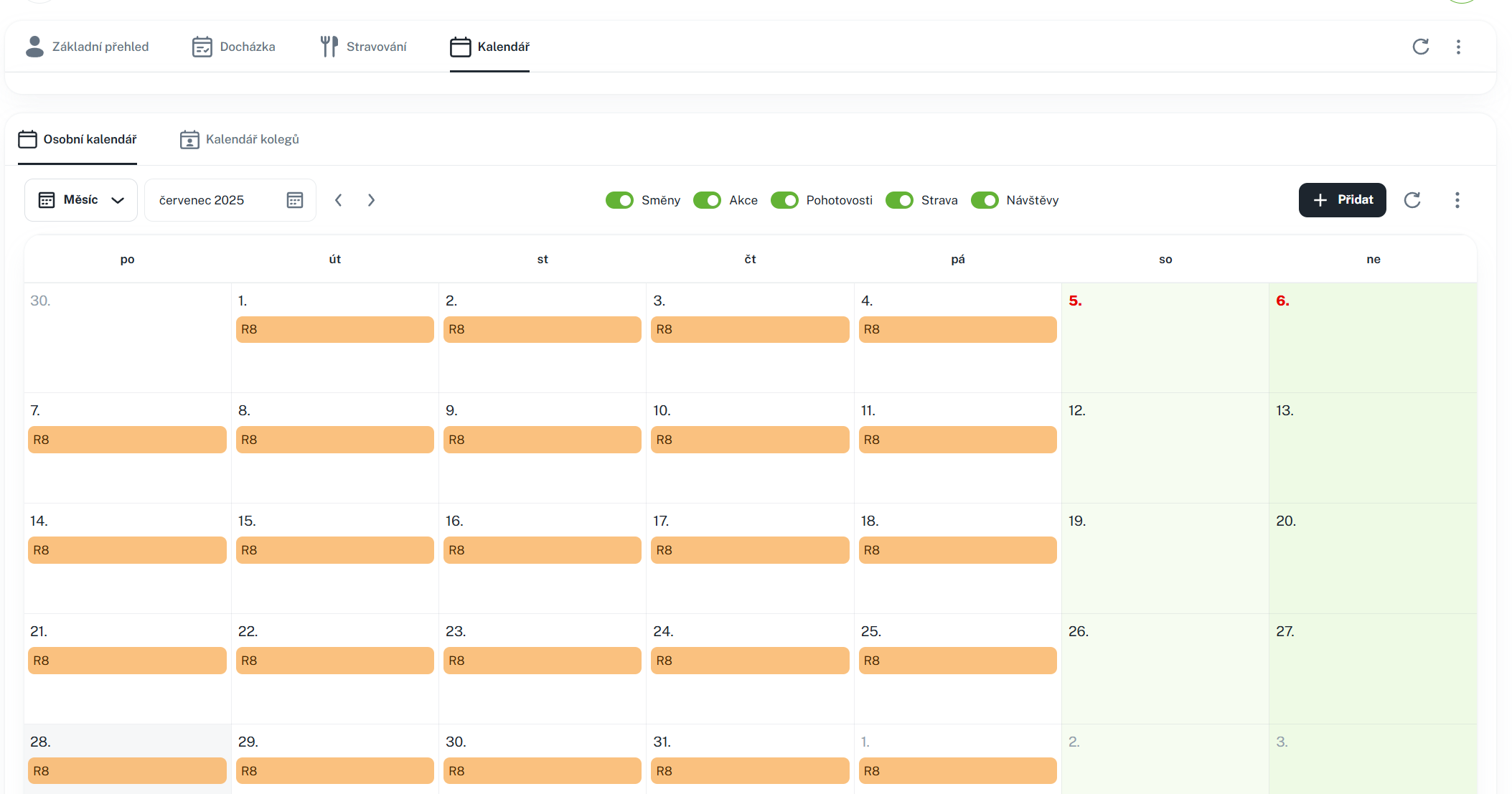 Zde je zobrazen kalendář dané osoby. Můžete z něj plánovat akce, směny a další události – funkcionalita je stejná jako u agendy Kalendář, rozdíl je pouze v tom, že zde plánujete za jinou osobu