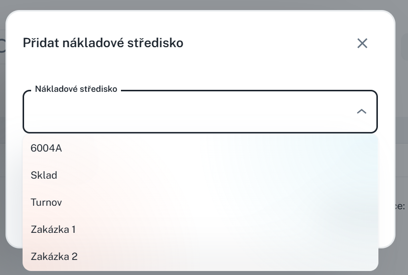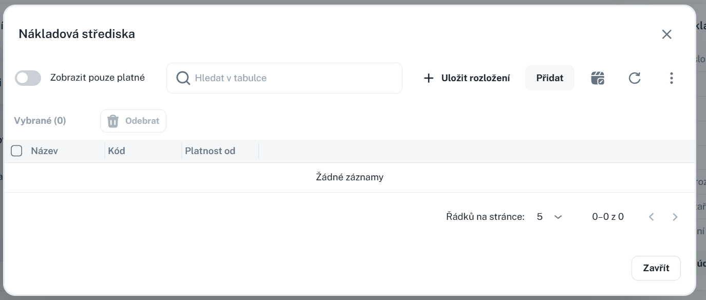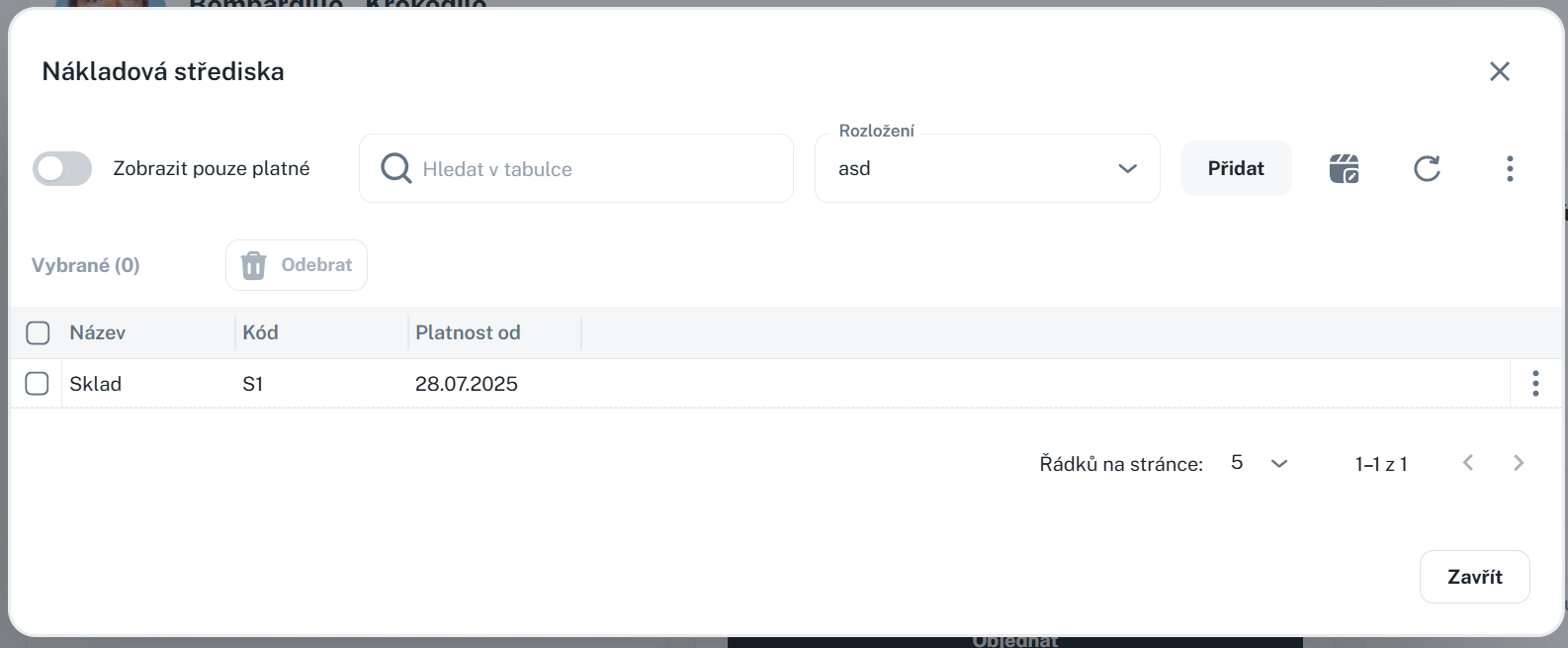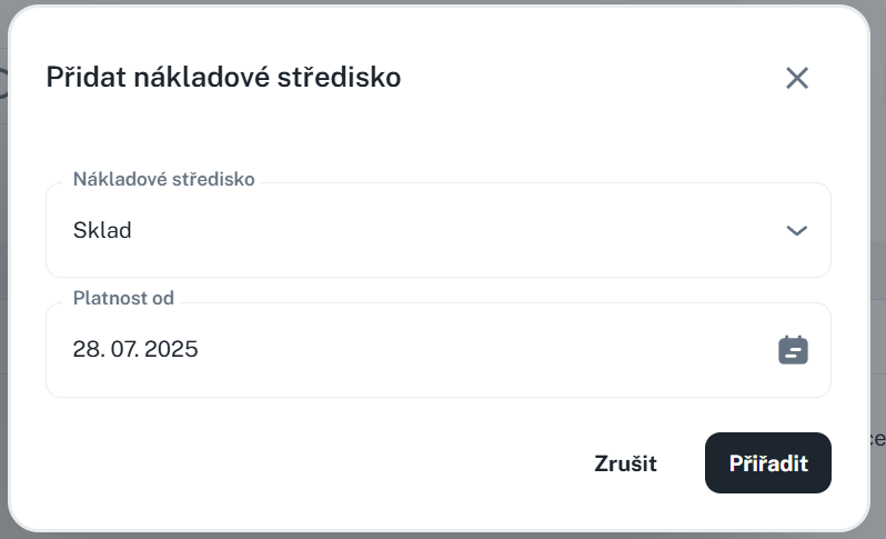 Kliknutím na “Přidat” se Vám zobrazí okno s výběrem středisek, po jeho zvolení nastavte datum platnosti a klikněte na “Přiřadit” → nákladové středisko se přiřadí osobě a objeví se v seznamu.
