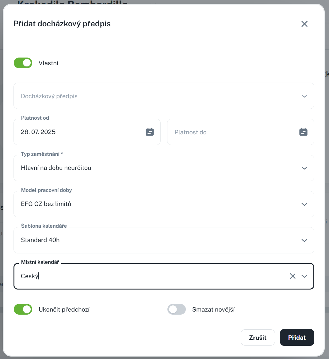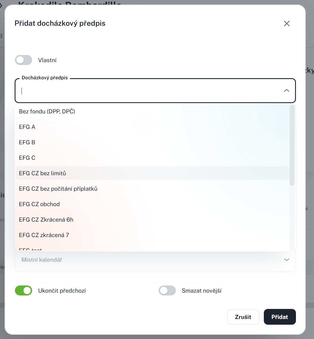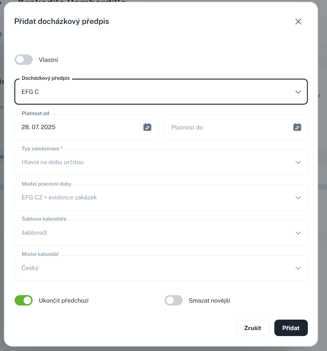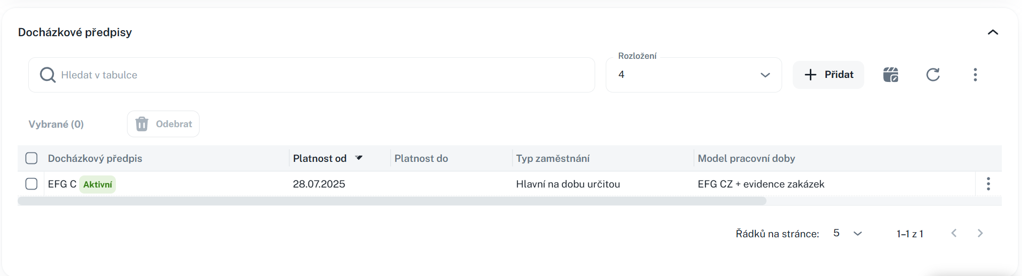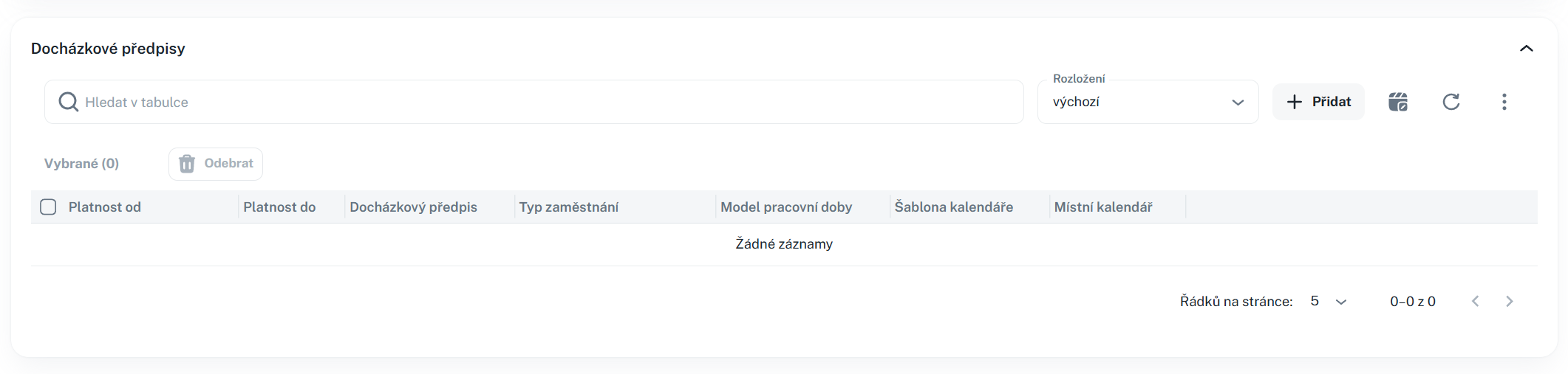 Nastavené předpisy - stačí kliknout na pole Docházkový předpis → vybrat jeden z nich a ostatní údaje se sami doplní. Jediné co bude nutné doplnit je platnost od kdy případně do kdy má předpis platit