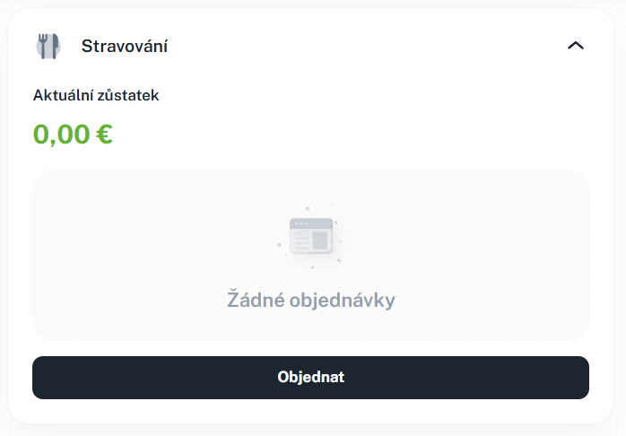 Pokud má osoba platnou kategorii strávníka a máte na to oprávnění, je možné za osobu objednat jídlo. Pod sekcí “Kategorie strávníka” je další sekce “Objednávka” skrze kterou lze objednat porce dané osobě.