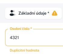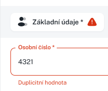V poli se musí vyskytovat jedinečná hodnota, jinak nelze uložit formulář. Rozdíl oproti klasické duplicitě je barva vykřičníku červená.