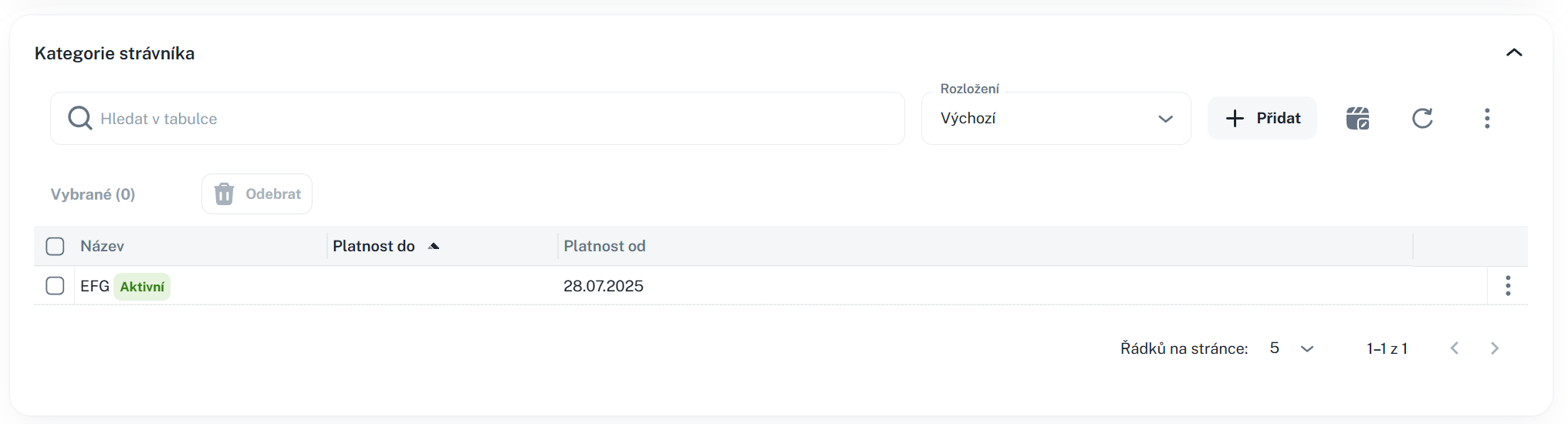 Upravit lze pouze platnost Od - Do případně kategorii ze záznamu zcela odebrat. K úpravě slouží kontextové menu, nebo tlačítko Odebrat, které se zpřístupní po označení dané kategorie