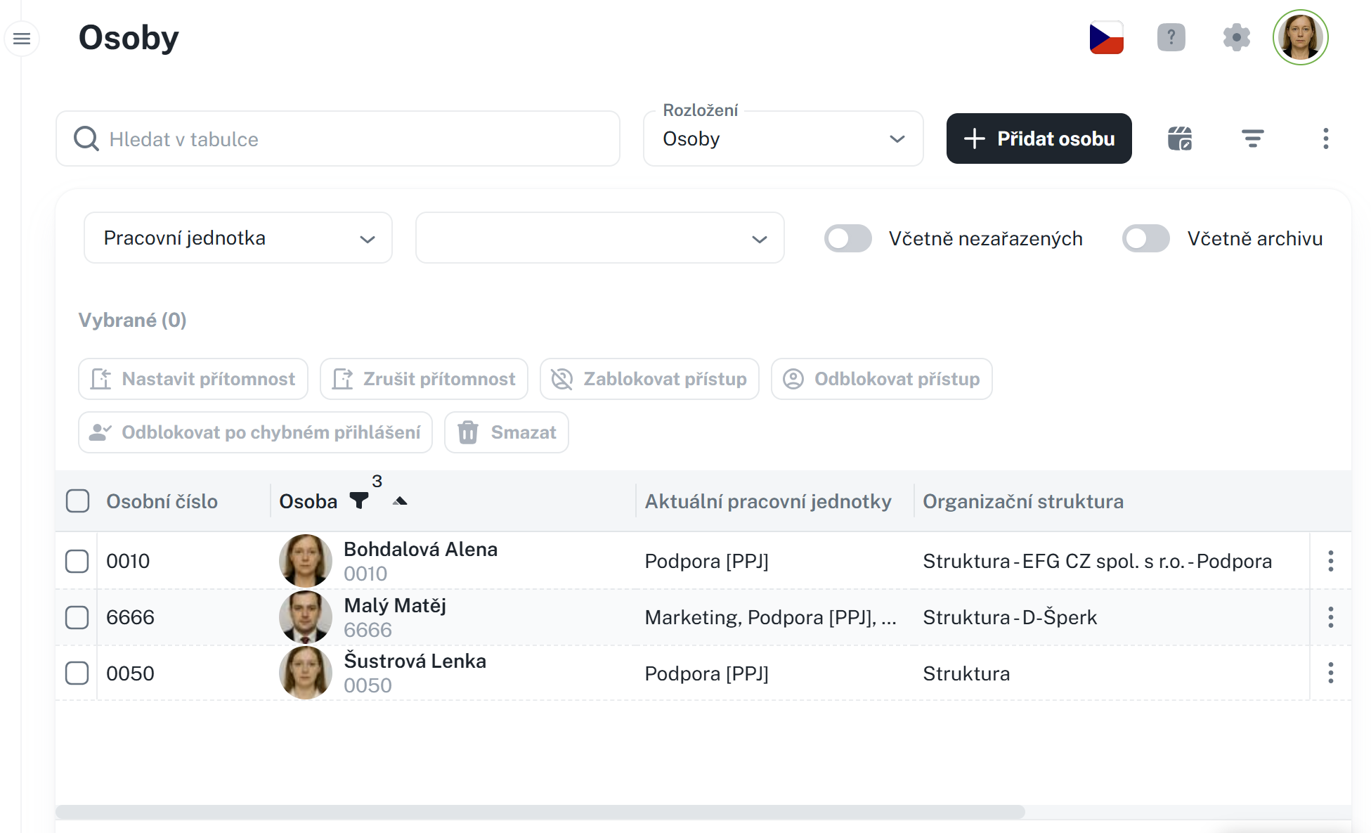 Seznam slouží k efektivní správě osob, včetně jejich hromadného přidávání, kopírování a provádění dalších akcí.