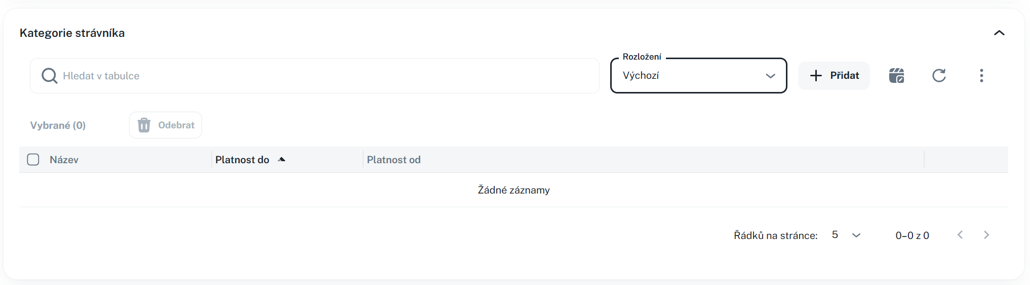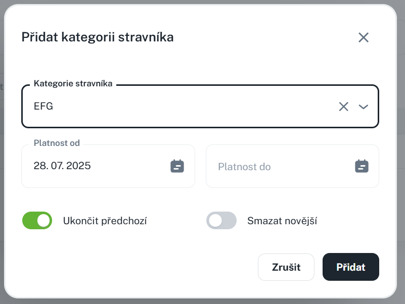 Přidání kategorie je obdobné jako u docházkového předpisu → po kliknutí na “Přidat” se vám otevře okno, kde si jednoduše vyberete danou kategorii a nastavíte platnost Od případě Do → klikem na “Přidat” pak uložíte volbu.