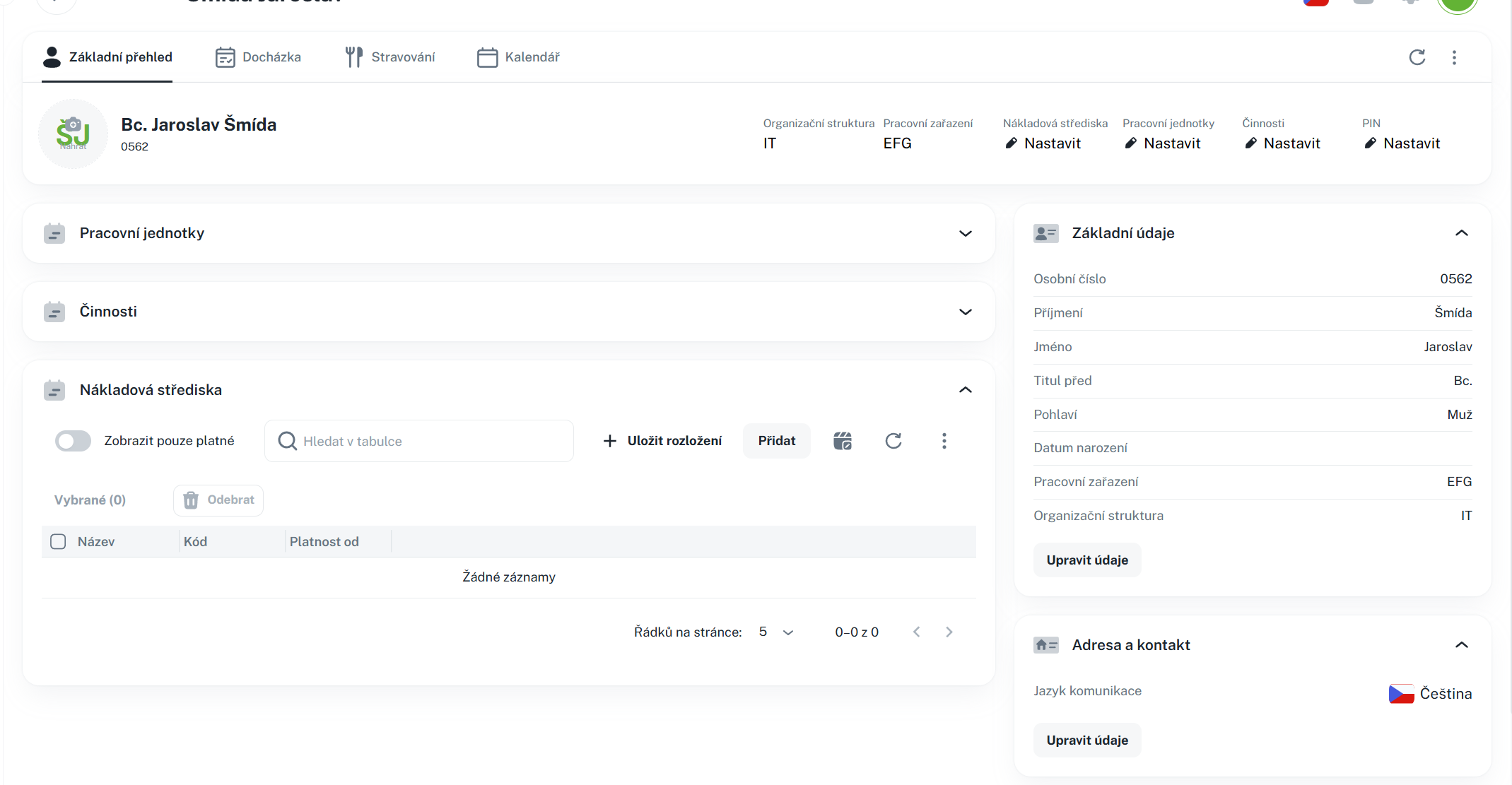 Tato sekce slouží k nastavení základních informací o osobě, jako je pracovní jednotka, zařazení a organizační struktura a tak dále. Veškeré údaje lze kdykoli upravit.