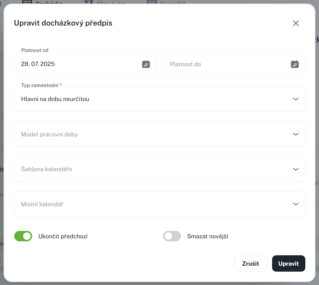 Slouží k nastavení předpisu osobě, dle kterého se poté řídí docházka dané osoby. Předpis nastavíte klikem na nastavit.