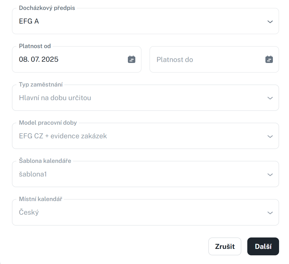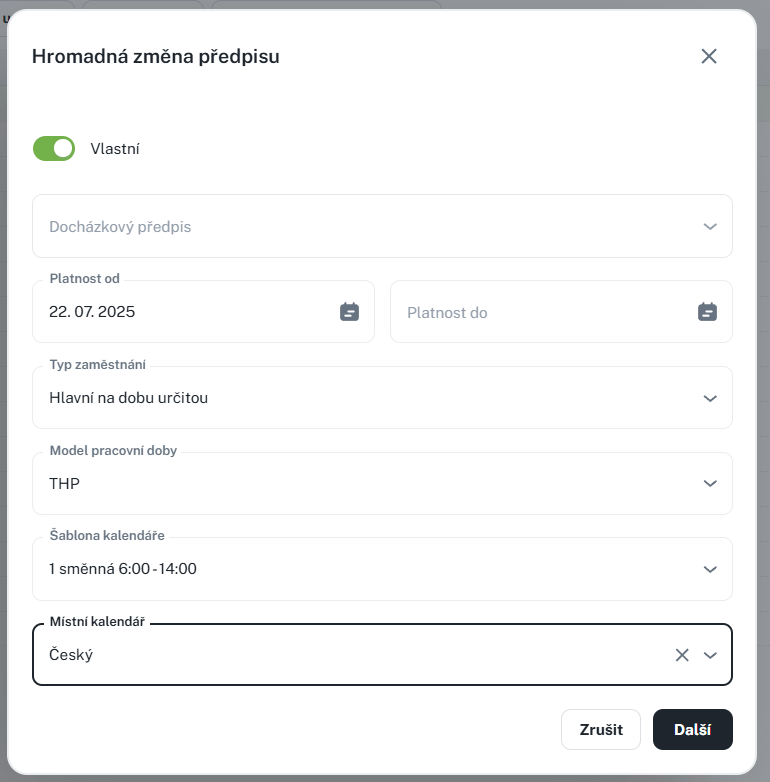 Vyberte docházkový předpis. Je také možné zaškrtnout pole Vlastní a detaily vyplnit ručně.