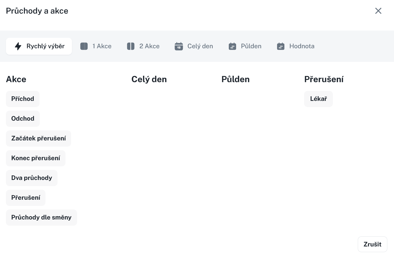 1 Akce umožňuje zaregistrovat jen Příchod/Odchod/Začátek přerušení apod. Vhodné např. pro doplnění zapomenutého průchodu.