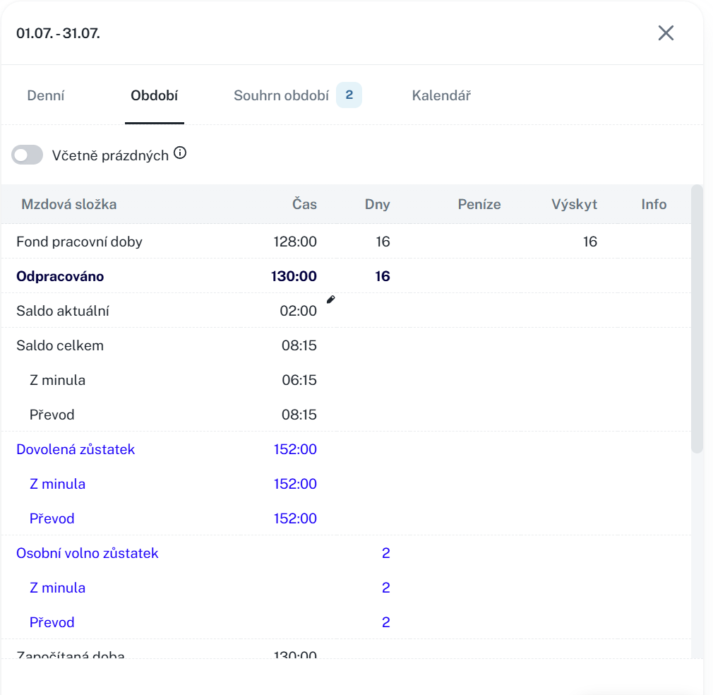 V případě, že uzavíráte docházku před koncem období, stiskněte tlačítko Přepočet do konce období a docházkové údaje osoby se přepočítají do konce aktuálního období, tj. při měsíčním do konce měsíce. Poté zkontrolujte, zda jsou spočítána data i za poslední dny v měsíci.