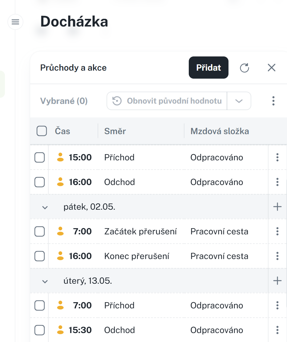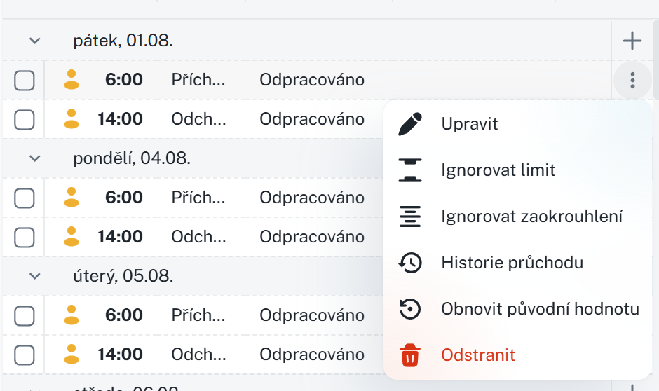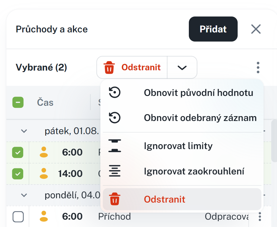 Pracovat s průchody a akcemi – jak zobrazit, upravit, odstranit nebo přidat nové záznamy docházky.