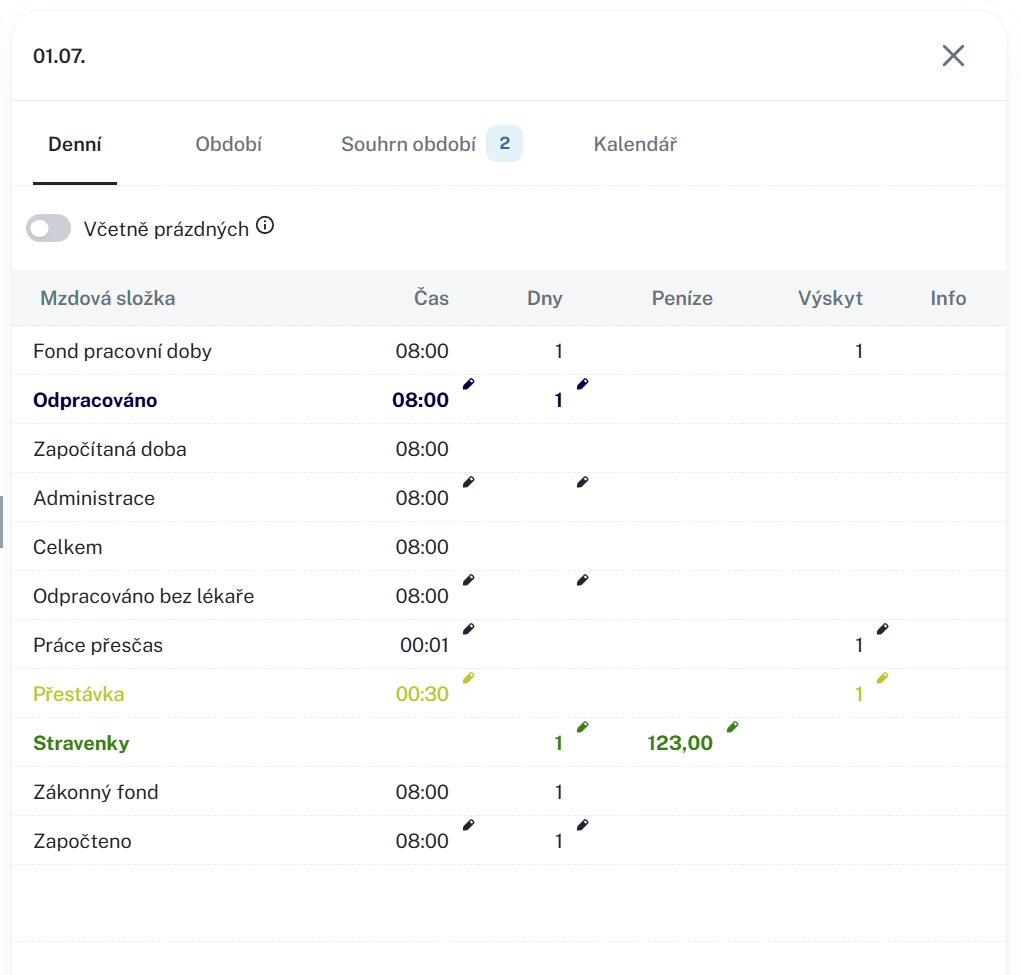 Tato záložka představuje detailní pohled na mzdové složky směn zaměstnance v daném období.