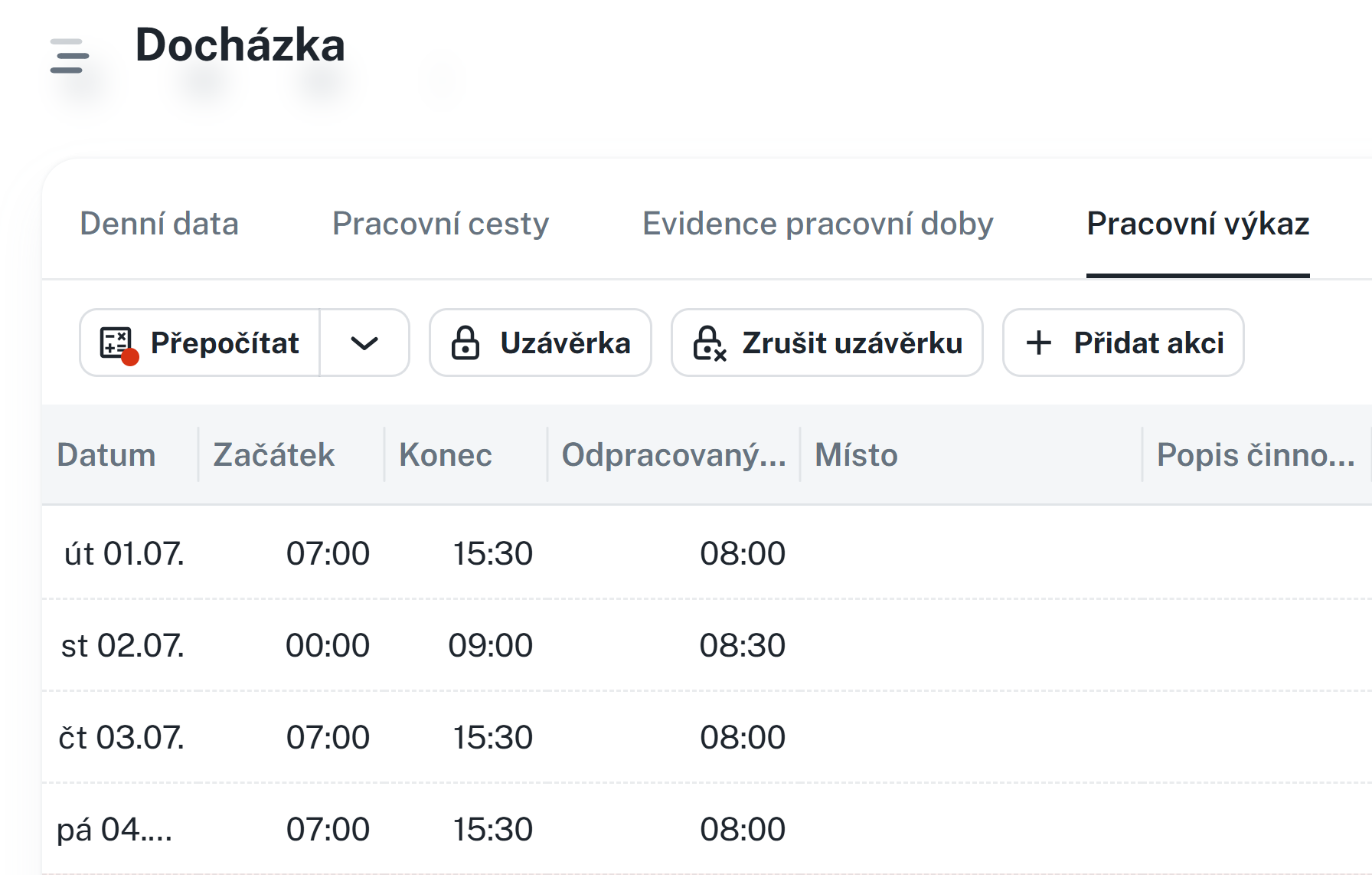 Příklad použití: Zaměstnanec má poslední 2 týdny v měsíci dovolenou a potřebujete jeho docházku uzavřít nyní a dále ji zpracovat ještě před koncem daného období.