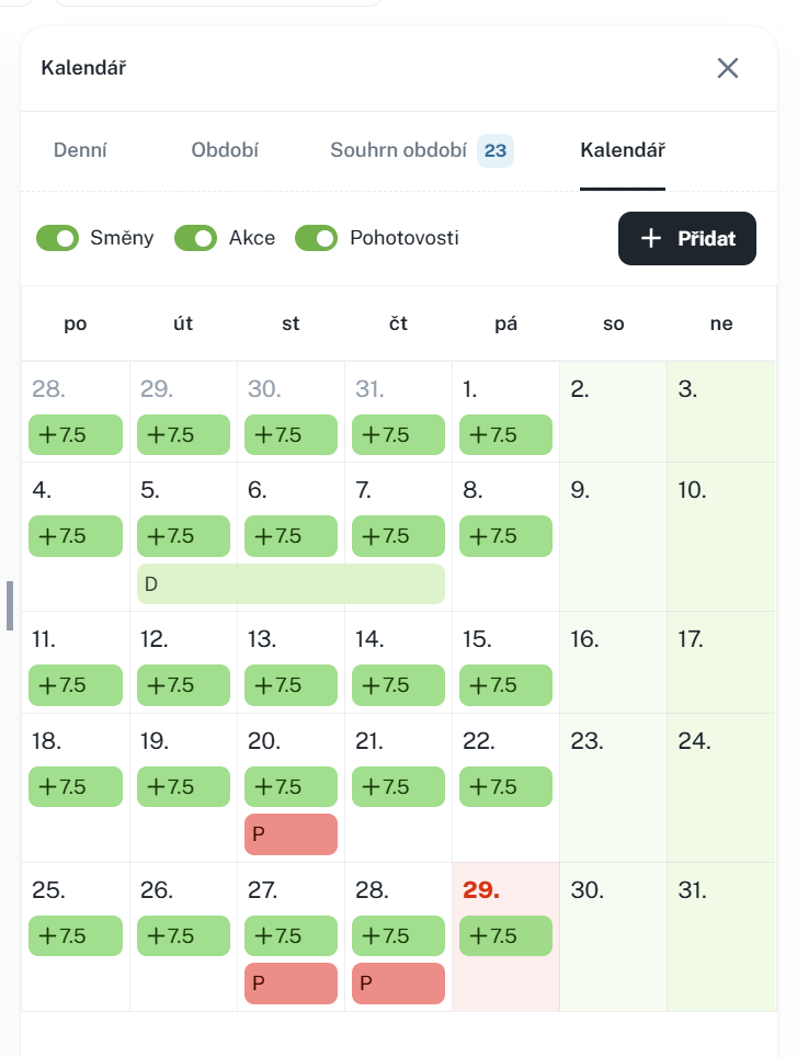 Postranní panel poskytuje měsíční přehled všech průchodů podle jednotlivých dnů. Umožňuje rychlou kontrolu a úpravu docházkových záznamů přímo z jednoho místa.