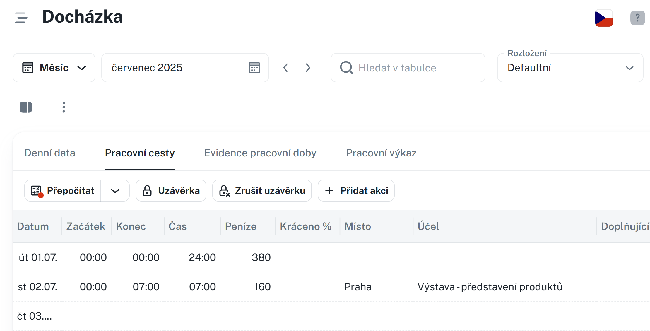 Tato záložka představuje detailní pohled na realizované pracovní cesty v daném období.