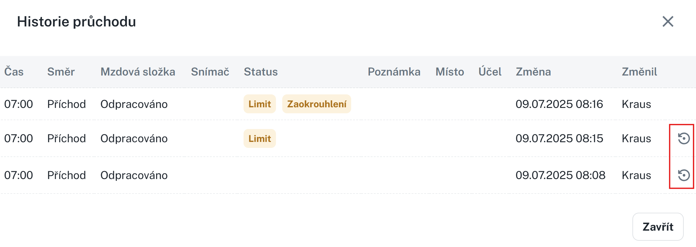 Historie průchodu - Otevře formulář s historií změn záznamu. Po kliknutí na tlačítko vrácení změny (viz. obr.) je možné změnu vrátit.