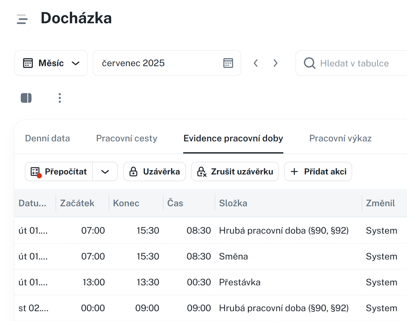 Přepočtu docházky - datum posledního přepočtu společně s datumem přepočtu docházky.