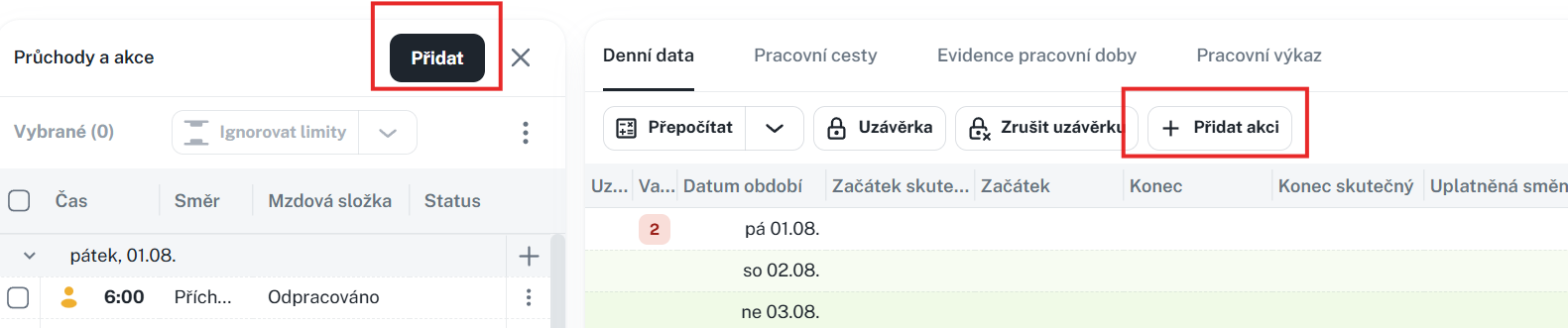 Přidání průchodu a akce slouží k manuálnímu doplnění údajů do docházkových dat (např. zaměstnanec nepoužil docházkový snímač, plánovaná dovolená). Přidat průchod (akci) je možné dvěma způsoby – v přehledu docházky tlačítkem Přidat akci a v osobním výkazu tlačítkem Přidat akci.