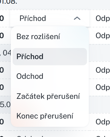 1 Akce umožňuje zaregistrovat jen Příchod/Odchod/Začátek přerušení apod. Vhodné např. pro doplnění zapomenutého průchodu.