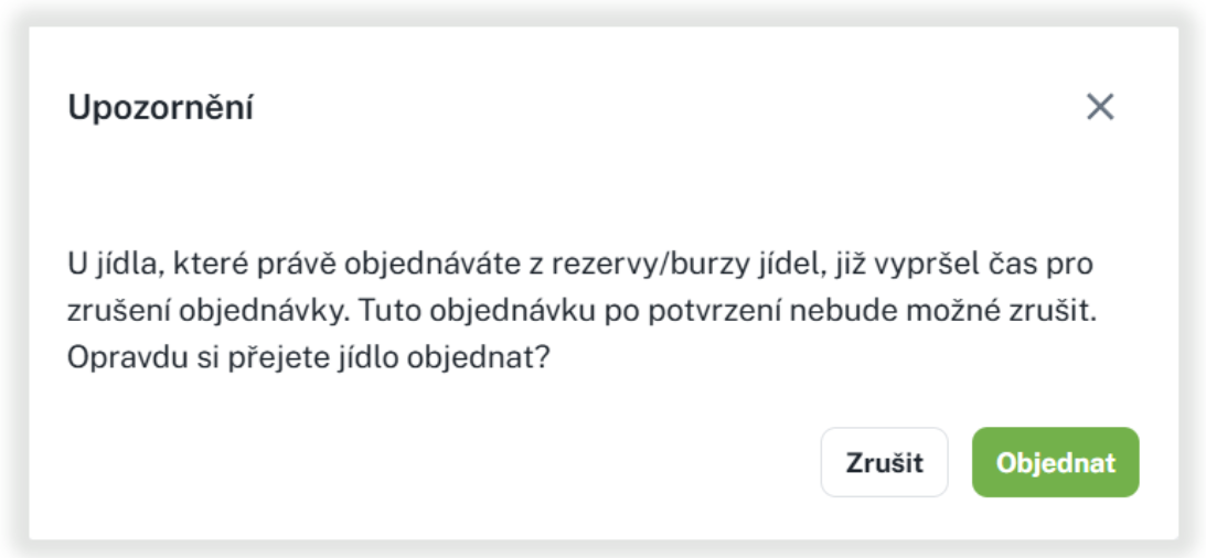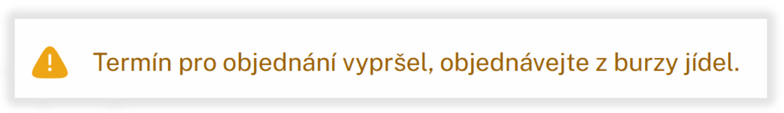 Po uplynutí času na objednávání se zobrazí hláška: "Termín pro objednávání vypršel, objednávejte z burzy jídel." a strávník může objednávat pouze jídla, která jsou v burze nebo jako rezerva jídel. Zrušení objednávky již není možné, jídlo je však možné přesunout do burzy.