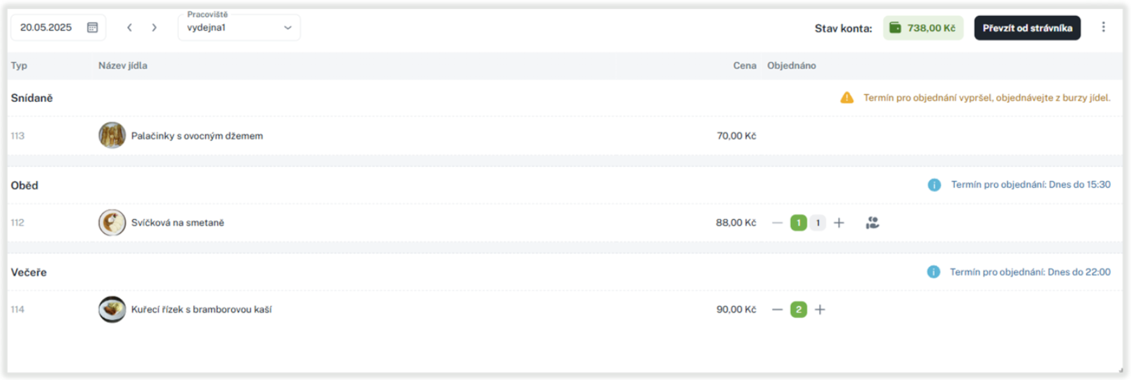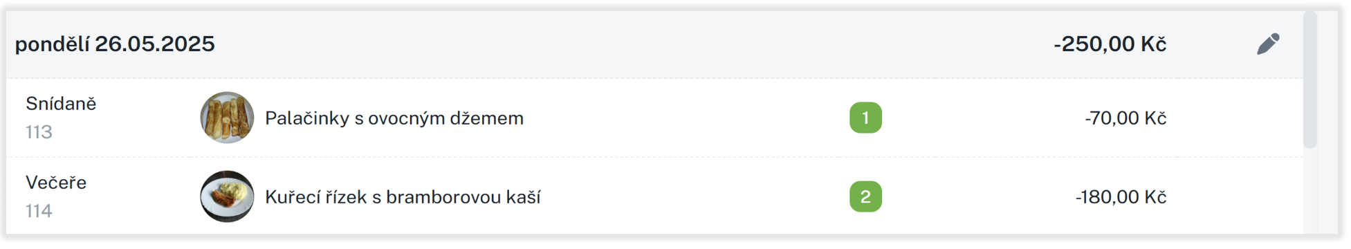 Kliknutím na ikonu tužky 🖉 nebo symbol plus „+” u daného záznamu se vrátíte na stránku s objednávkami jídel.