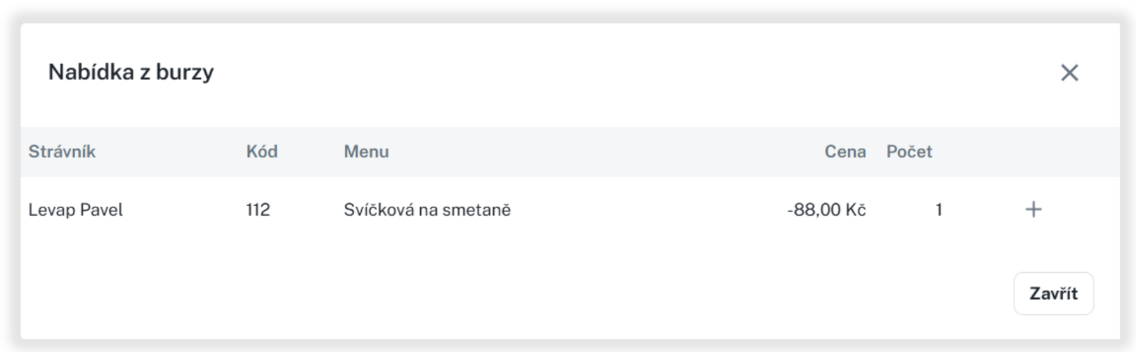 Jídlo je také možné převzít z burzy bez výběru strávníka formou klasické objednávky. Pokud se Vámi vybrané jídlo z jídelního listu nachází na burze a Vy si ho objednáte obyčejným kliknutím na tlačítko “+”, tak se automaticky převezme z burzy.