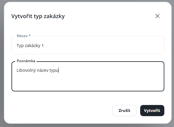 Nastavení typu zakázky slouží především pro zpřehlednění a rozdělení zakázek – podle typu zakázky je pak možné filtrovat v seznamech nebo například nastavit práva uživatelům na viditelnost/editaci/smazání těchto konkrétních typů. V systému může ale být pouze jeden typ zakázky, který bude nastaven u všech zakázek. Jedná se o povinný parametr zakázky.