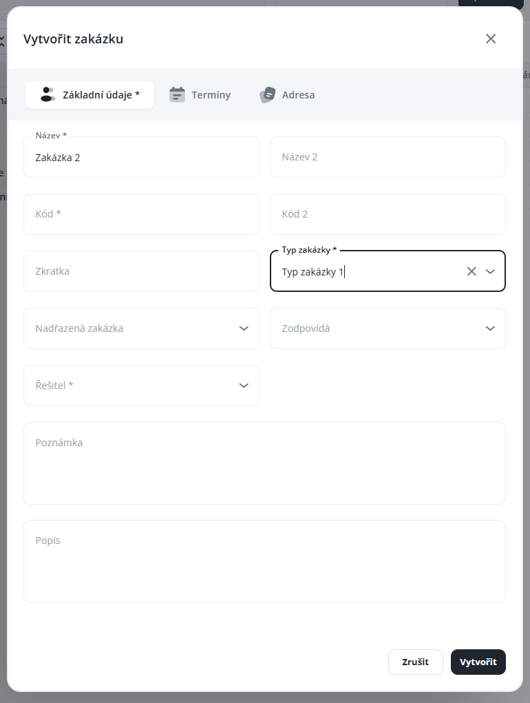 Typ zakázky je třeba vždy definovat při vytváření nové zakázky.