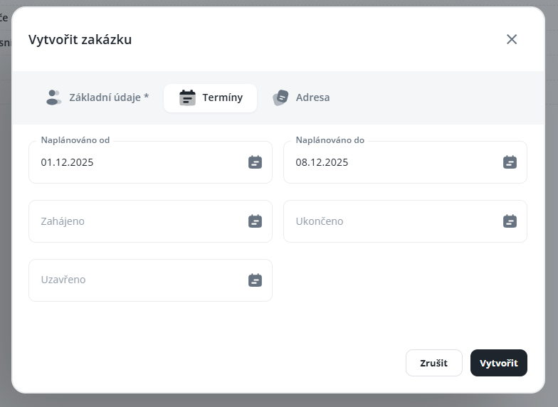 Zahájeno (při nastavení termínu je možné zároveň nastavit omezení plnění u všech účastníků podle tohoto data zahájení – ukončení – nebude pak možné evidovat čas na zakázce mimo tento termín)