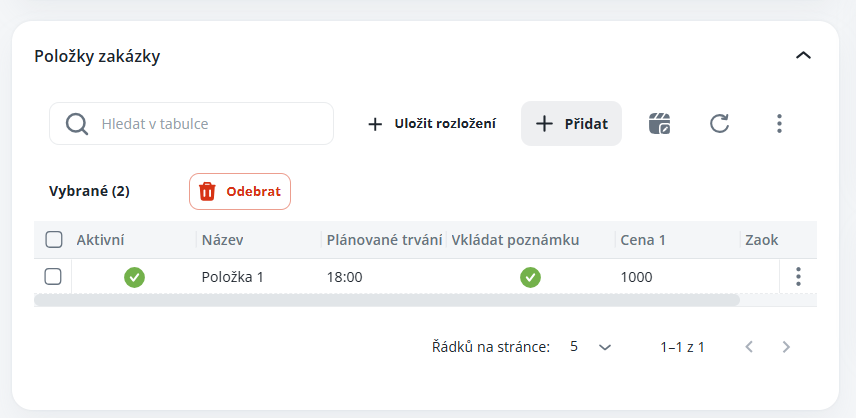 Aktivní – pokud není položka aktivní, nebude se nabízet v mobilní a webové aplikaci pro zadání plnění. Může sloužit jako příprava, případně se již položka nepoužívá, ale je nadále nutné ponechat nastavenou u zakázky, aby bylo možné nahlížet na historická data a plnění.