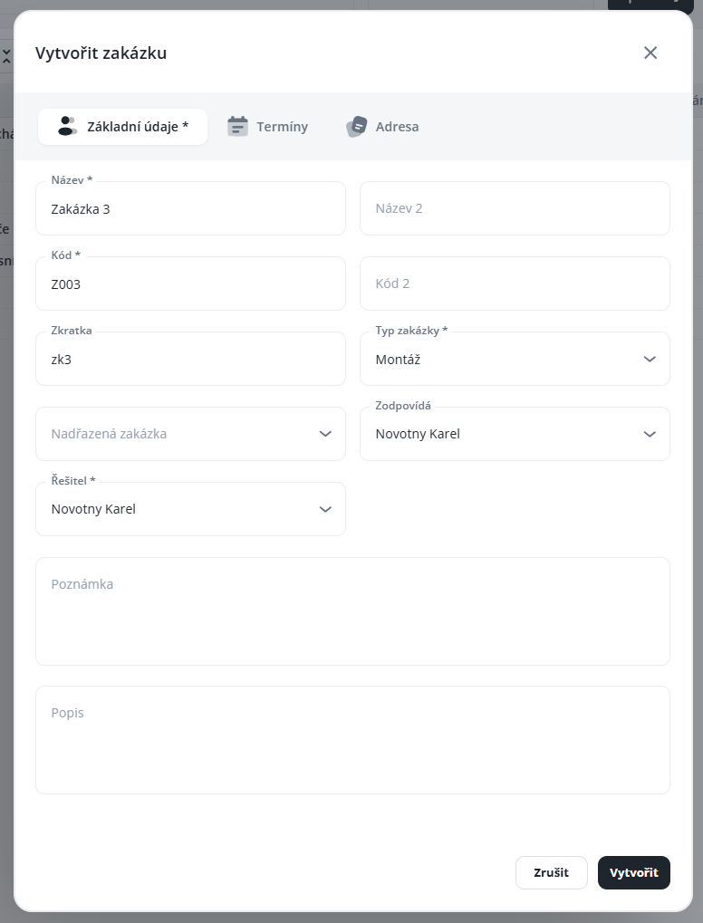 Jak vytvořit a spravovat zakázku – vyplnění základních údajů jako kód, název, typ zakázky, zodpovědná osoba, řešitel a poznámky, které usnadňují evidenci a filtrování v mobilní i webové aplikaci.