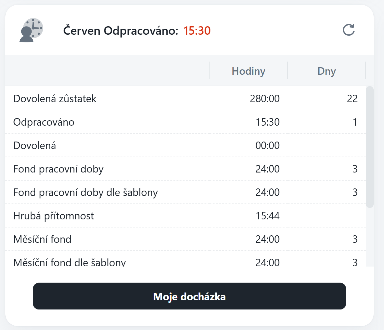 Slouží k detailnímu přehledu měsíční docházky a absence.