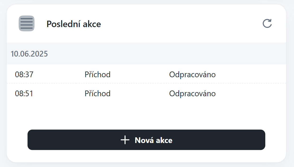 Zobrazuje docházkové záznamy v přehledném chronologickém seznamu. Také je skrze ni možné přidávat nové akce, průchod se automaticky připíše přihlášenému uživateli.