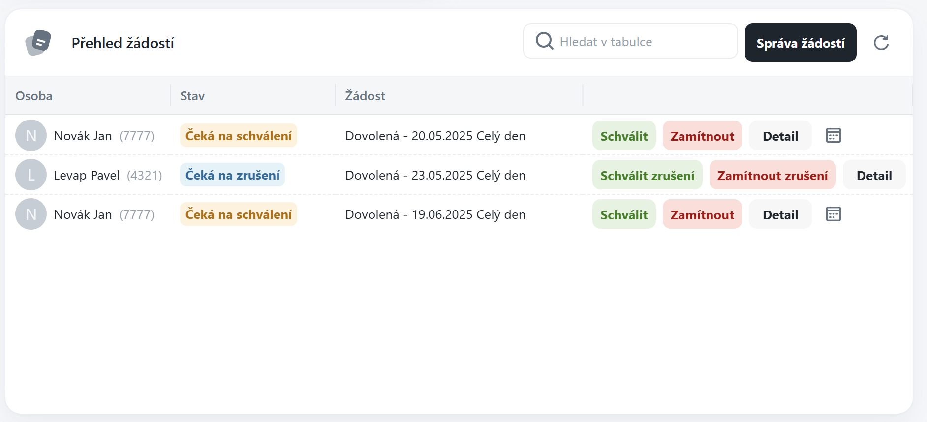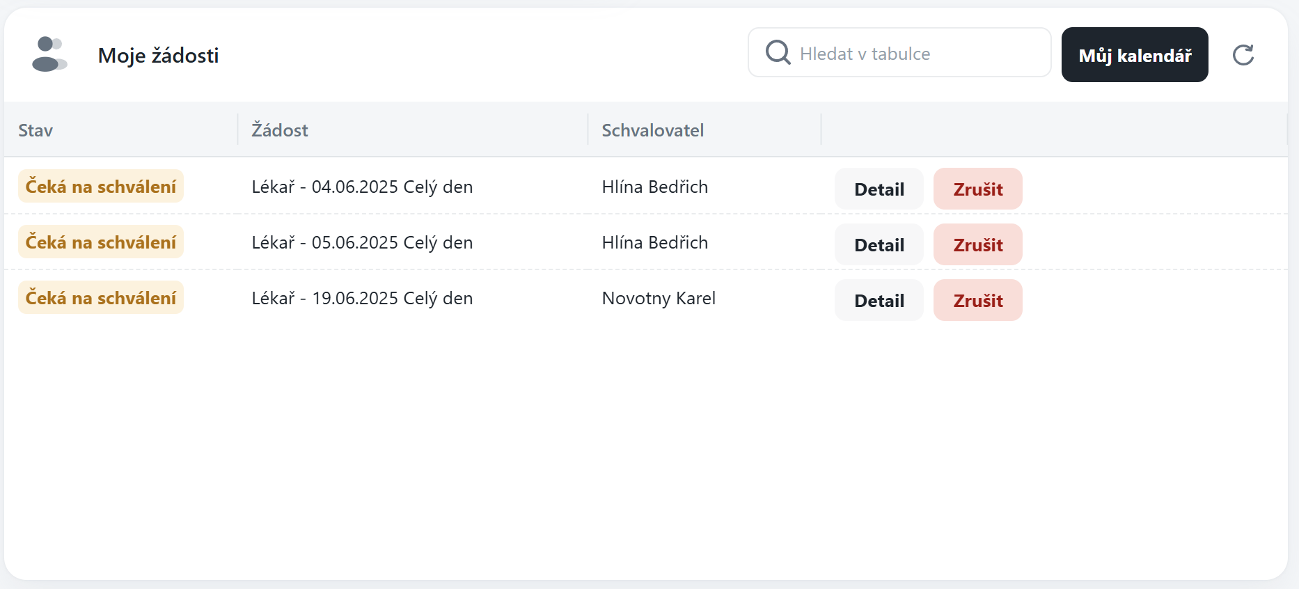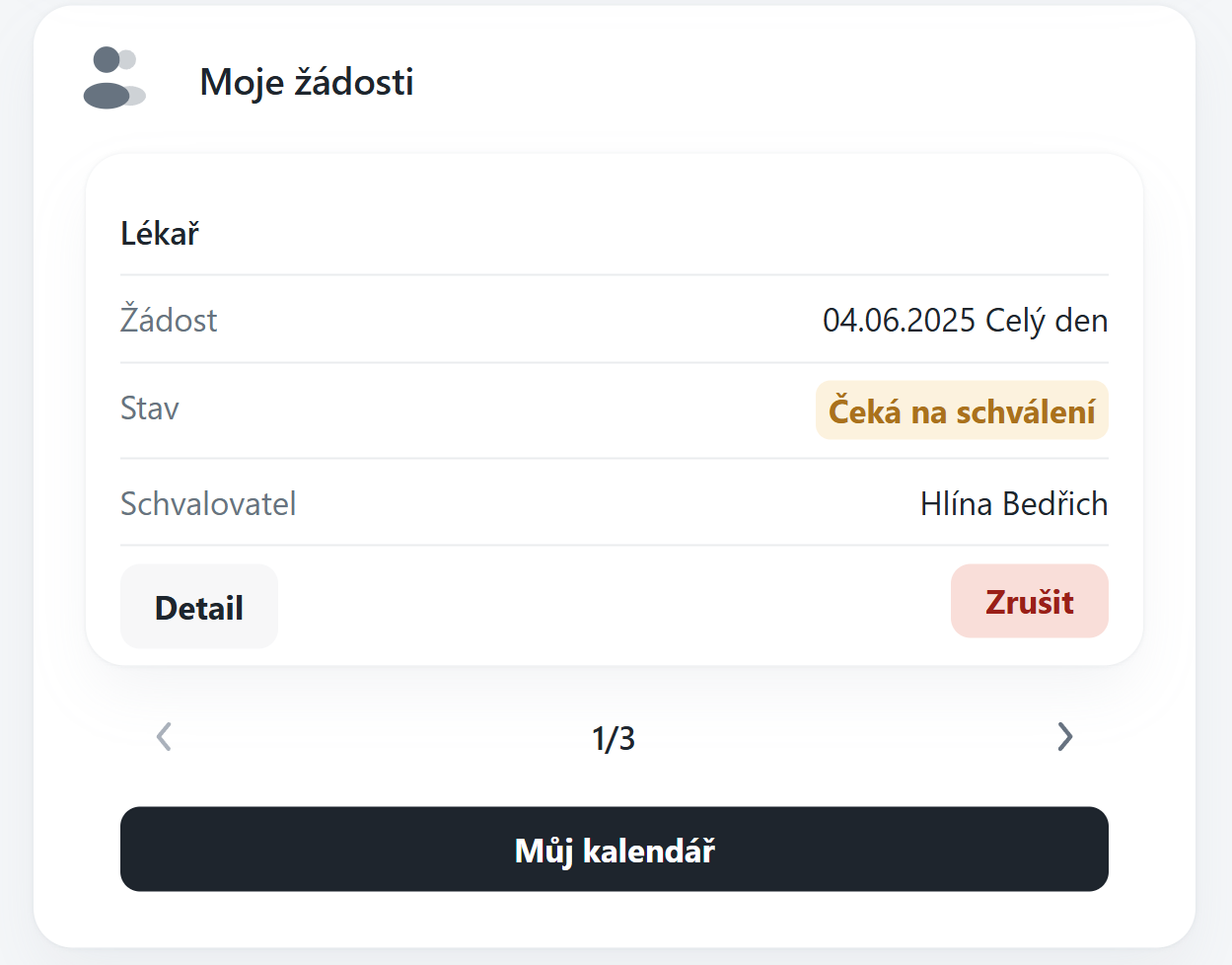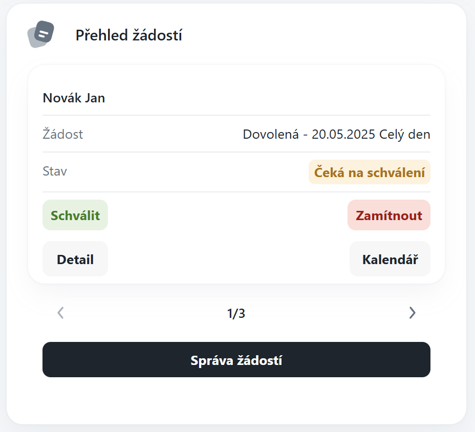 Tento widget poskytuje přehled všech žádostí ke schválení, které jsou přiřazeny aktuálně přihlášenému uživateli. Umožňuje efektivně zpracovávat žádosti přímo z dashboardu, bez nutnosti přecházet do dalších částí systému..