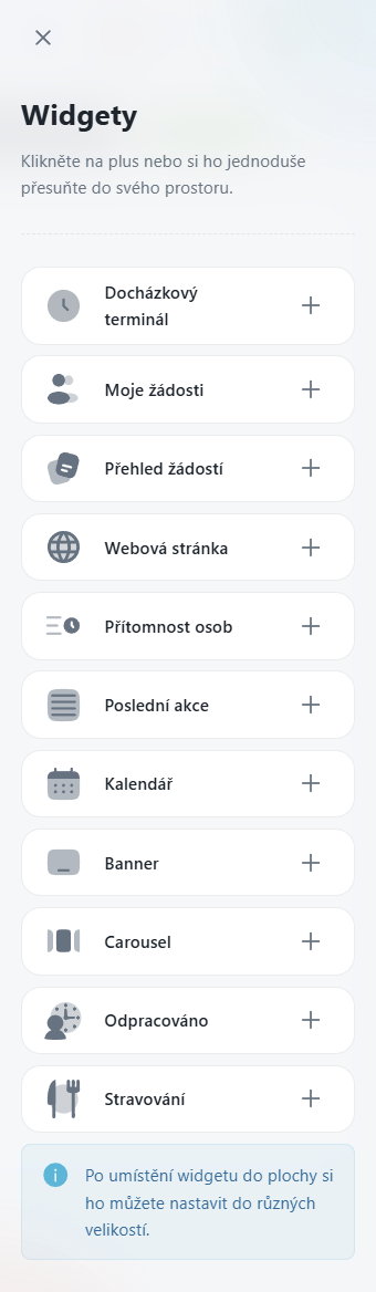Seznámíte se s funkcemi a účelem dostupných widgetů, včetně docházkových, stravovacích a doplňkových.