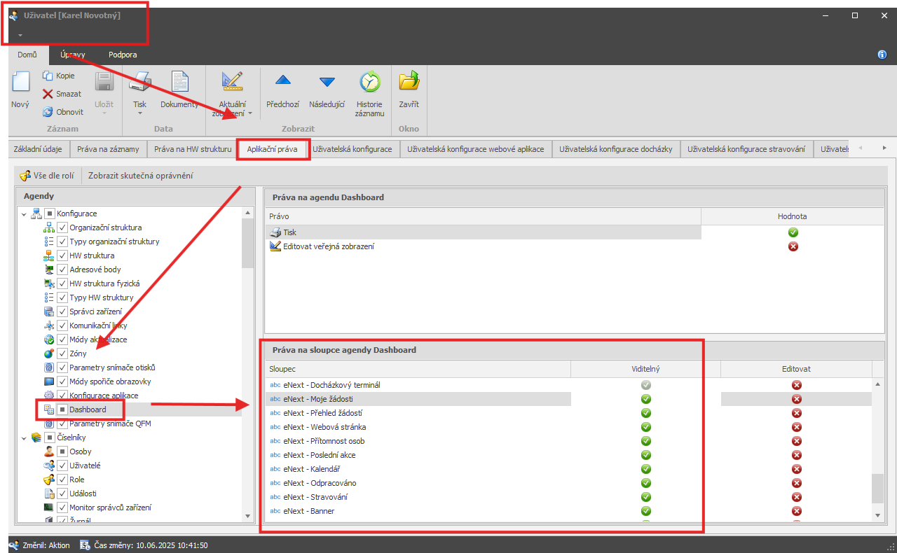 Detail uživatele → záložka ,,Aplikační práva" → pod sekcí ,,Konfigurace” najděte ,,Dashboard”
