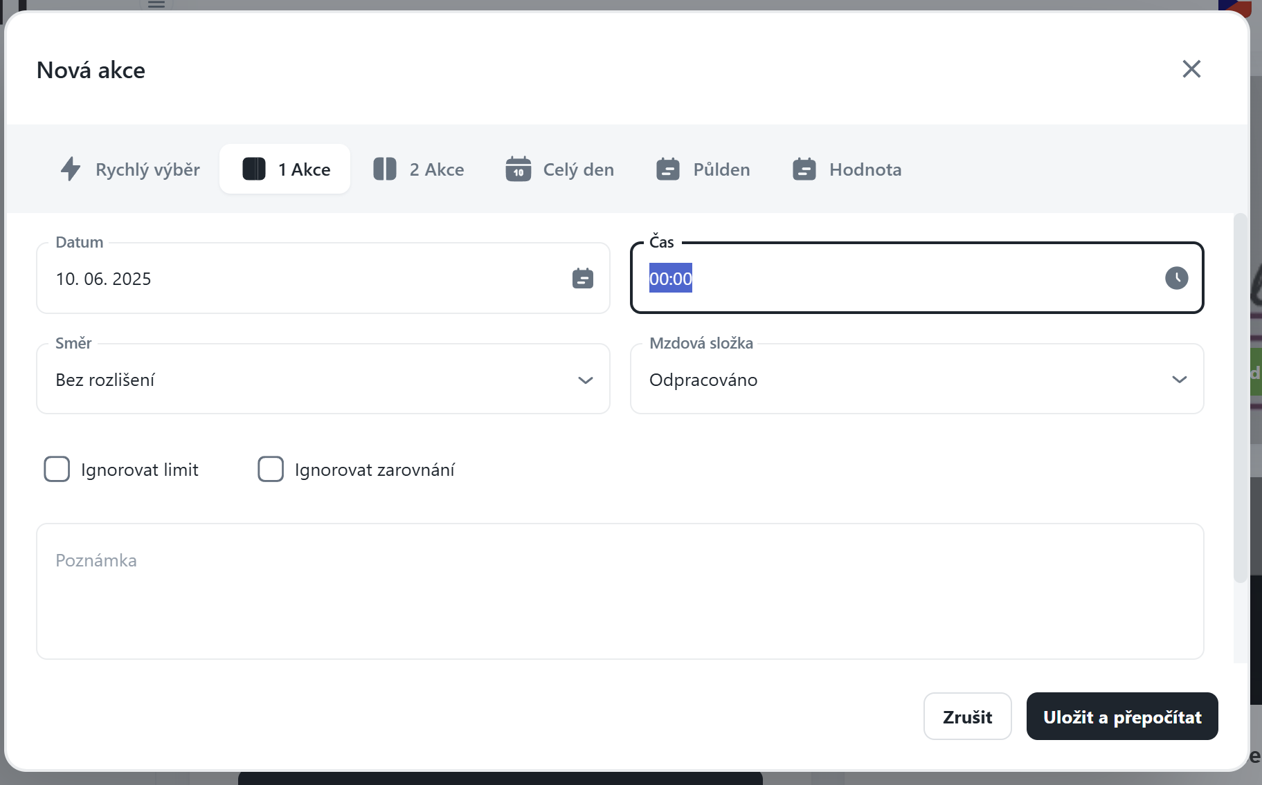Přidat novou akci – např. při chybějícím záznamu