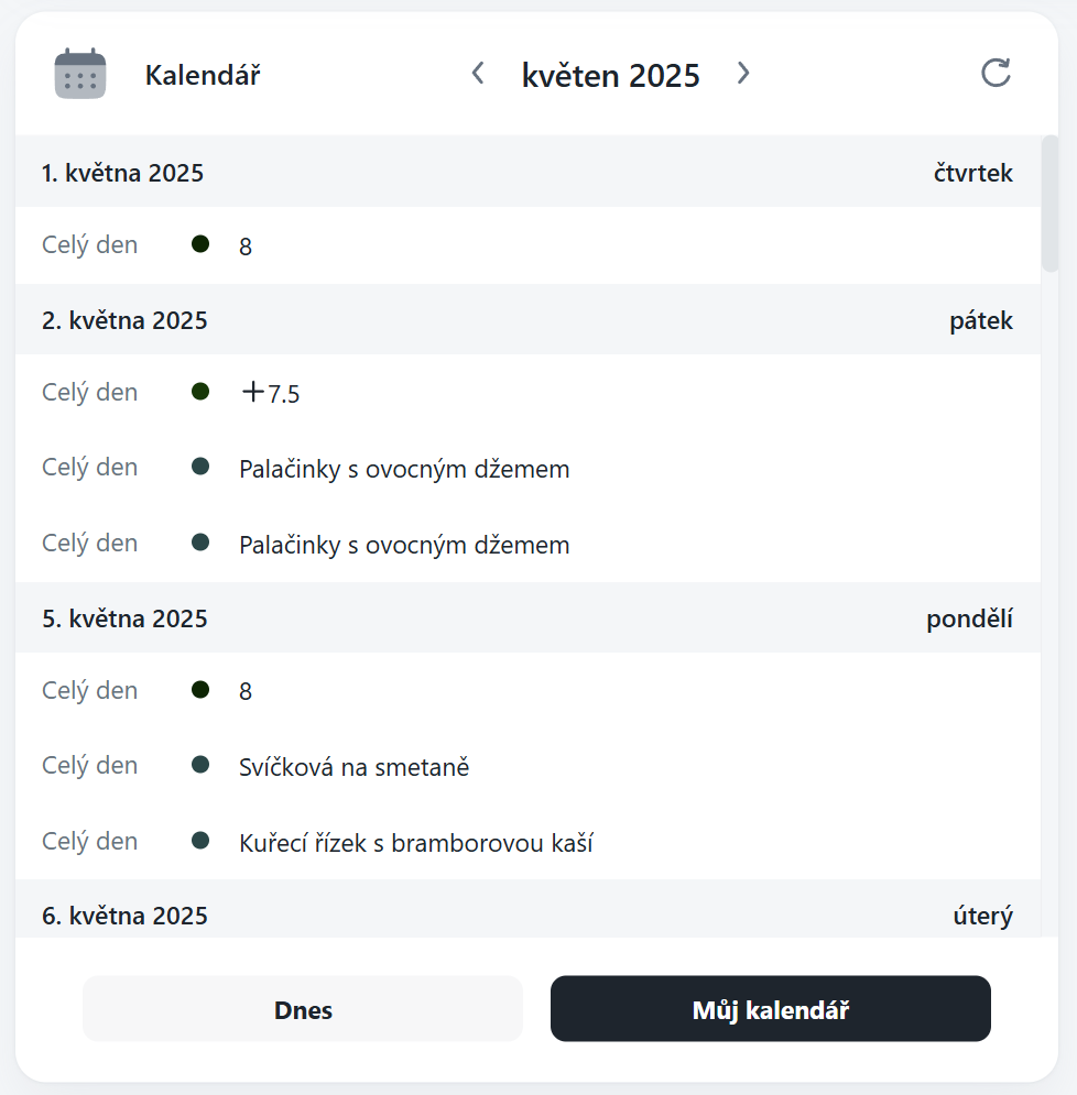 Widget slouží především k rychlému přehledu. Pro zadávání a úpravu údajů použij agendu Kalendář, která nabízí plnou funkčnost. Velikost widgetu si vyberte podle toho, jak detailní přehled potřebujete – menší velikost je vhodná pro rychlé náhledy, větší pak pro komplexnější zobrazení.