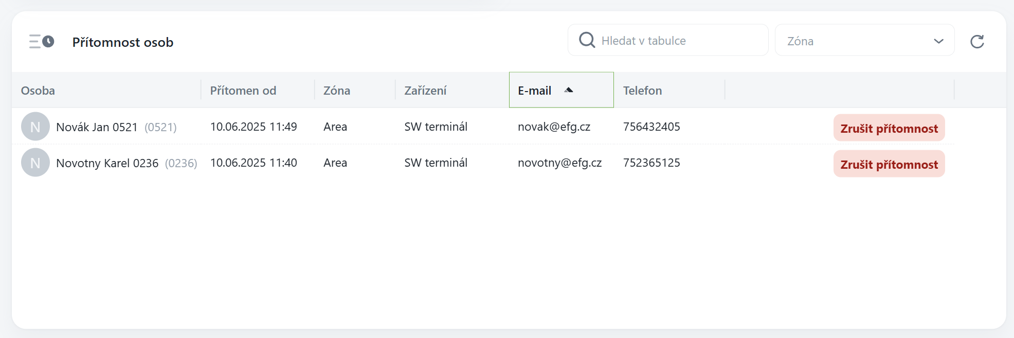 Zobrazuje aktuální seznam přítomných osob v systému.