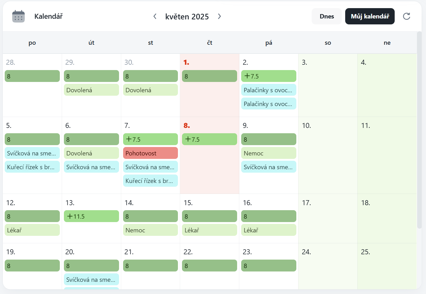 Tento widget slouží k zobrazení směn, žádostí a naplánovaných akcí v měsíčním přehledu. Umožňuje rychlý náhled dat bez nutnosti přecházet do plnohodnotné agendy Kalendář.