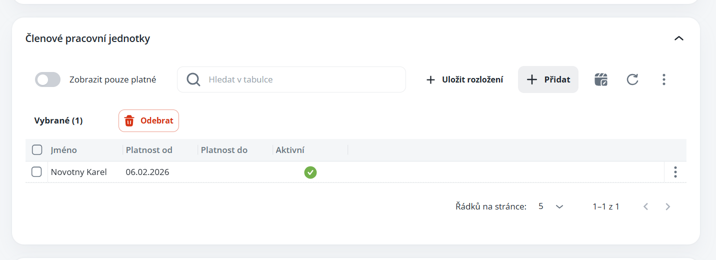 Pomocí tlačítka Přidat/Odebrat lze měnit členy pracovní jednotky + filtrace pouze platných členů.