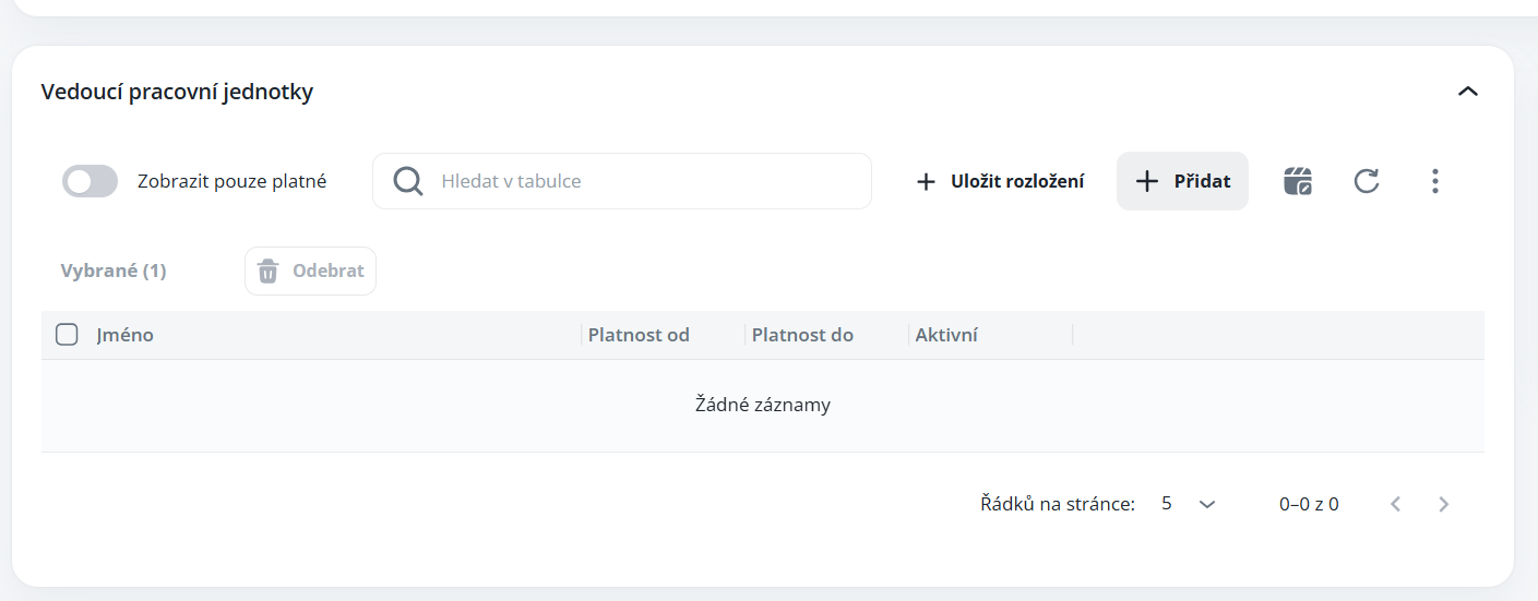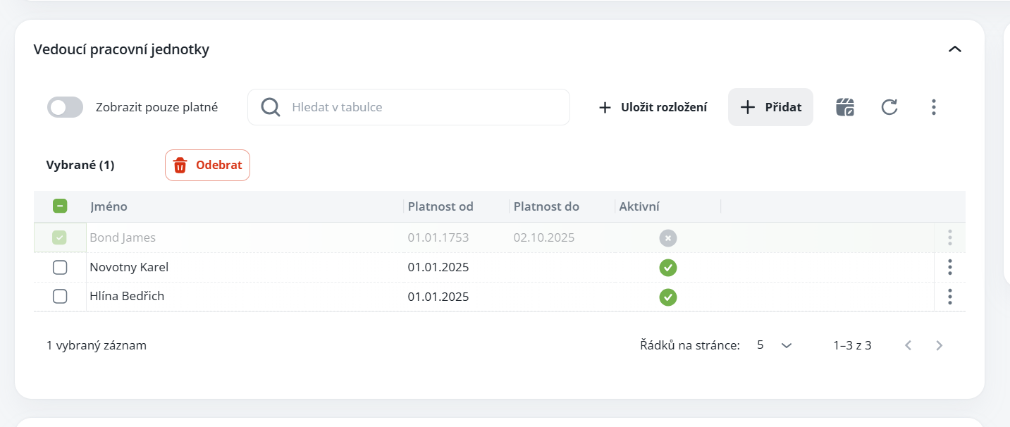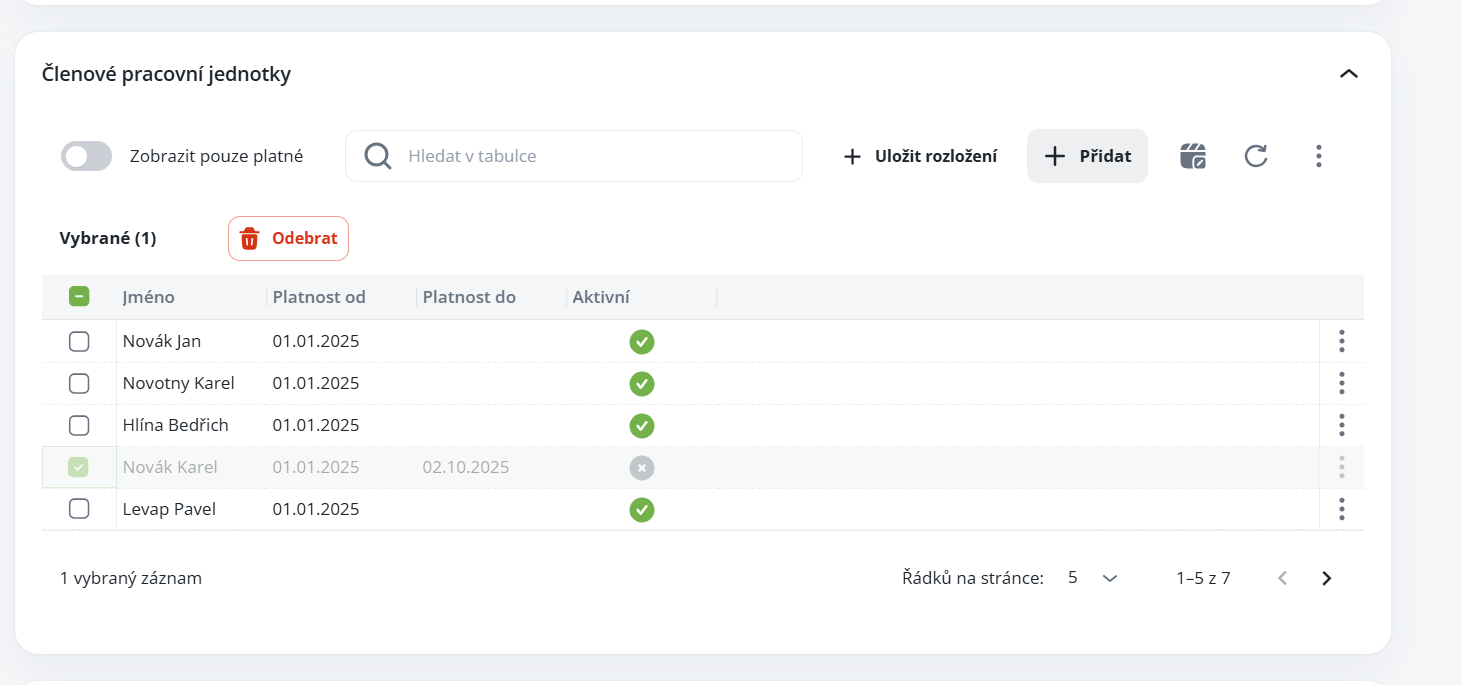 Pomocí tlačítka Přidat/Odebrat lze měnit vedoucí pracovní jednotky. Případně si můžete vyfiltrovat pouze platné členy.