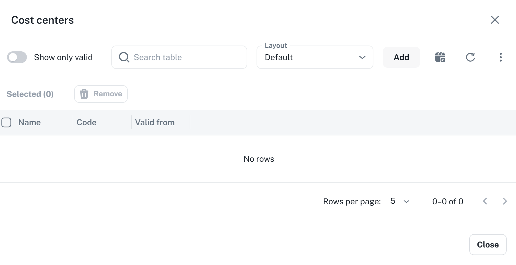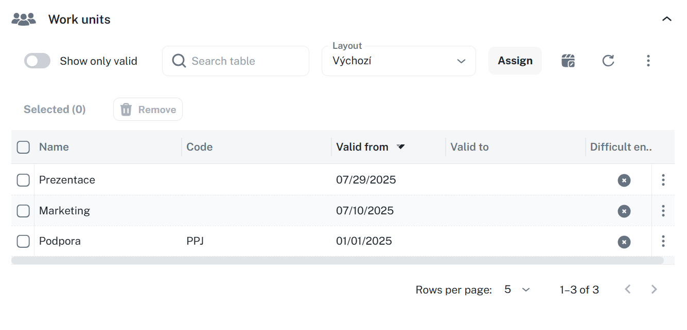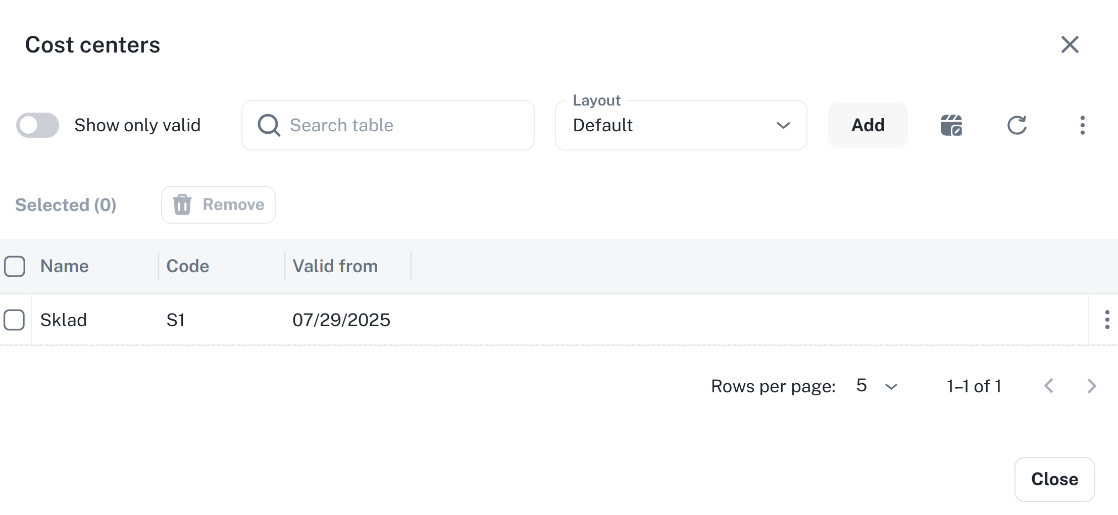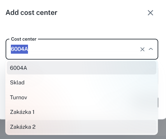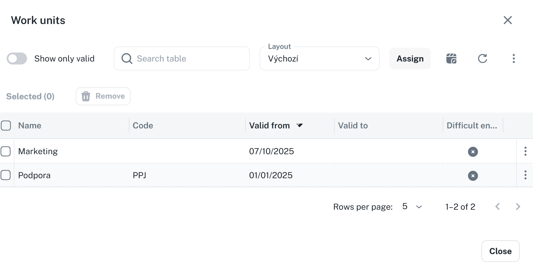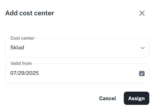 By clicking on Add, a window with a selection of cost centers will be displayed. After selecting the desired cost center, set the validity date and click on Assign → the cost center will be assigned to the person and will appear in the list.