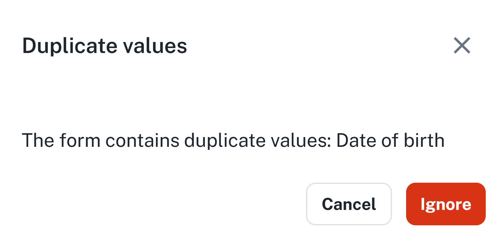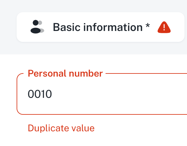 A unique value must be present in the field, otherwise the form cannot be saved. The difference compared to a standard duplicate is the exclamation mark color being red.