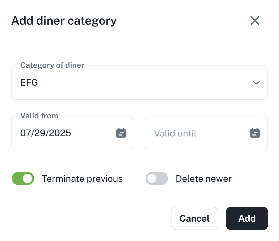 This section allows you to set the category of the diner and, if necessary, place a meal order for a specific person.