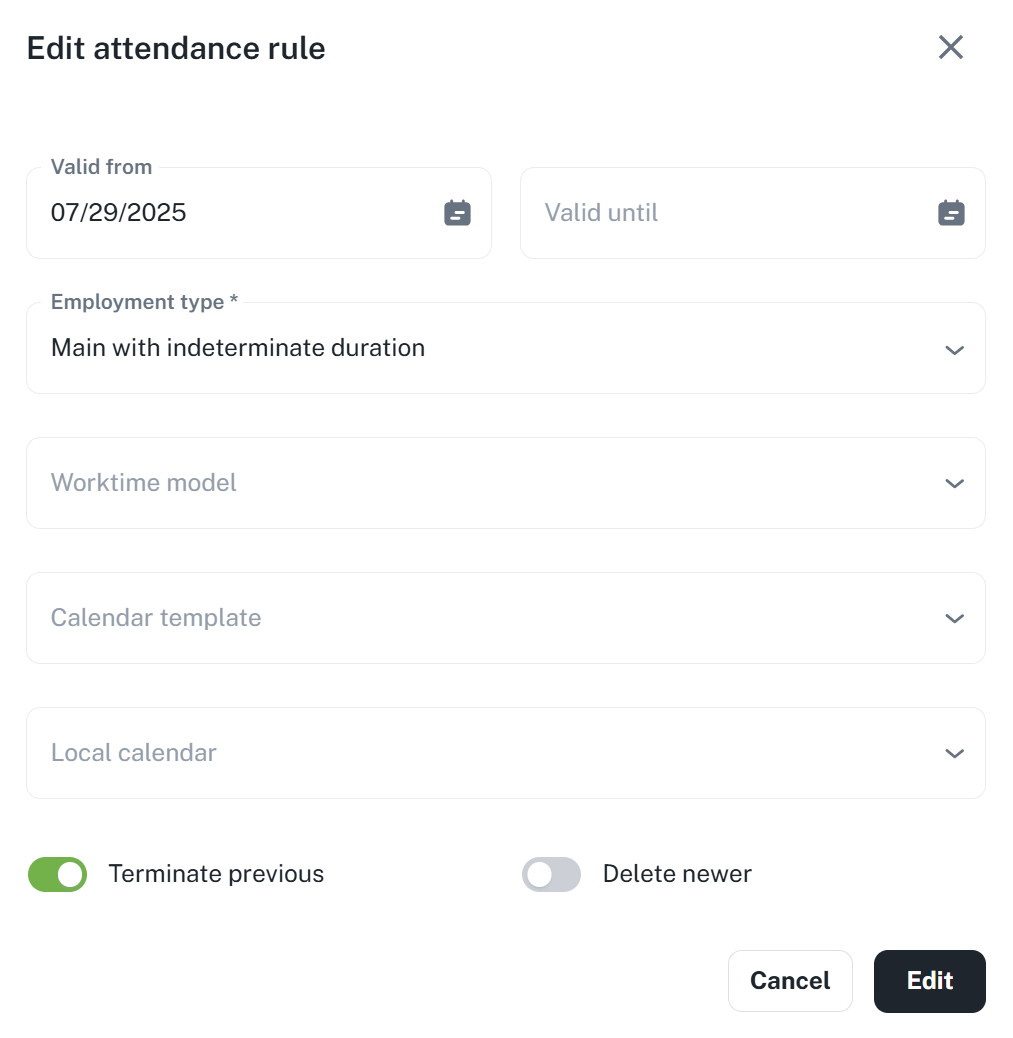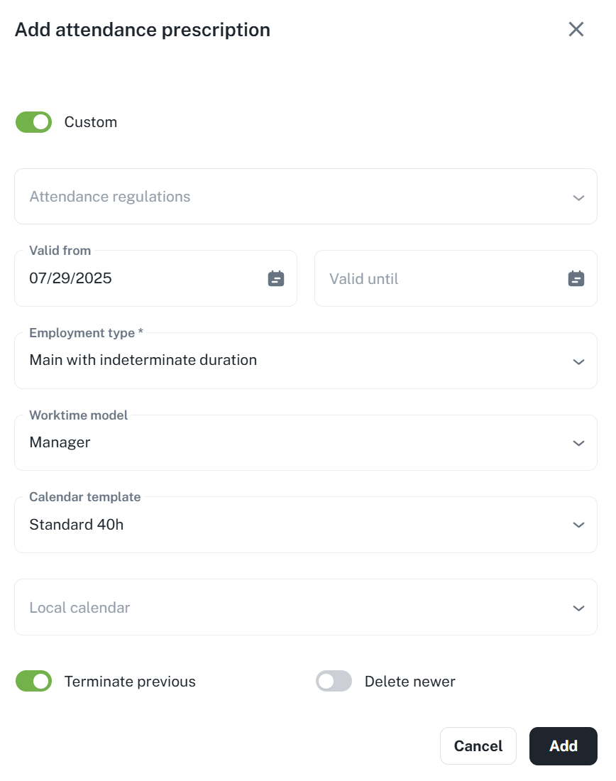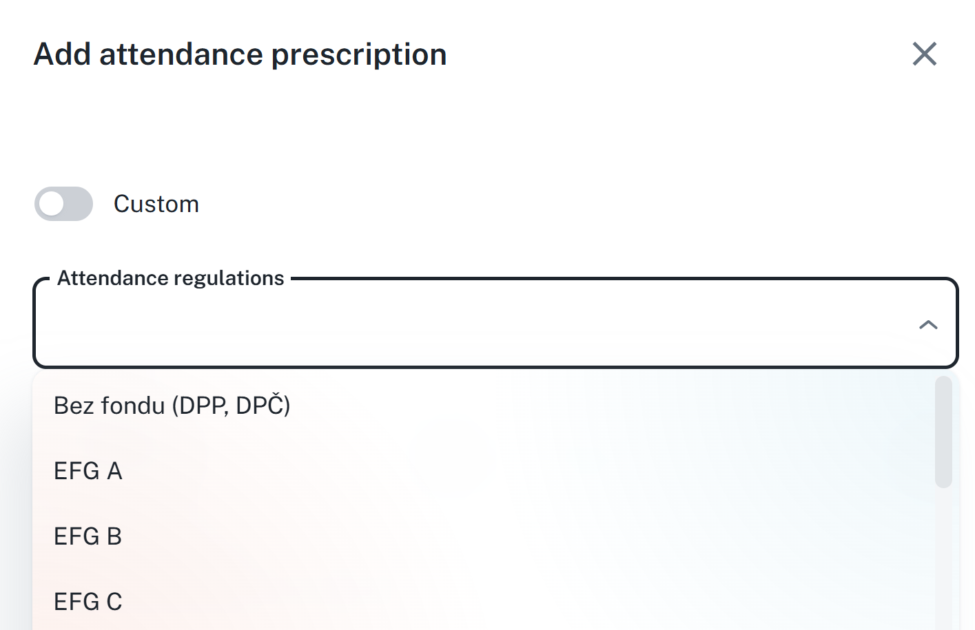 Attendance regulations - simply click on the Attendance regulations field → select one of them and the other details will fill in automatically. The only thing that will need to be specified is the validity from when or, if applicable, until when the regulation should apply.