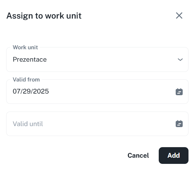By clicking Assign, a window will appear with a unit selection. After selecting, set the effective date and, if necessary, the expiration date, then click Add → the work unit will be assigned to the person and will appear in the list.
